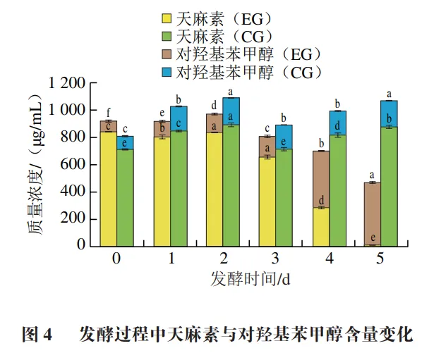 由图4可知,天麻经红茶菌发酵后,发酵液中的天麻素与对羟基苯甲醇(天麻苷元)质量浓度发生明显变化。发酵前2 d,实验组的天麻素质量浓度变化幅度较小,从第3天开始,天麻素质量浓度大幅降低,天麻素质量浓度由835.68 μg/mL降至11.04 μg/mL;对羟基苯甲醇从第3天开始有明显增加趋势,发酵初始质量浓度为78.05 μg/mL,发酵5 d达到最大值456.66 μg/mL,为初始质量浓度的5.85 倍。对照组的天麻素与对羟基苯甲醇质量浓度分别维持在712.58~891.62 μg/mL和94.86~191.97 μg/mL之间,与实验组的变化幅度相比,总体变化不显著,其质量浓度的变化可能是发酵过程中天麻释放部分对羟基苯甲醇导致。实验组的天麻素与对羟基苯甲醇的总质量浓度降低。天麻素属于小分子酚型糖苷类化合物,部分天麻素经微生物作用后,分解产生对羟基苯甲醇,还有巴利森苷等小分子物质。因此,发酵过程中,红茶菌不但会利用多糖,还会利用天麻素中的葡萄糖基,分解产生小分子物质,导致其含量大大减少。