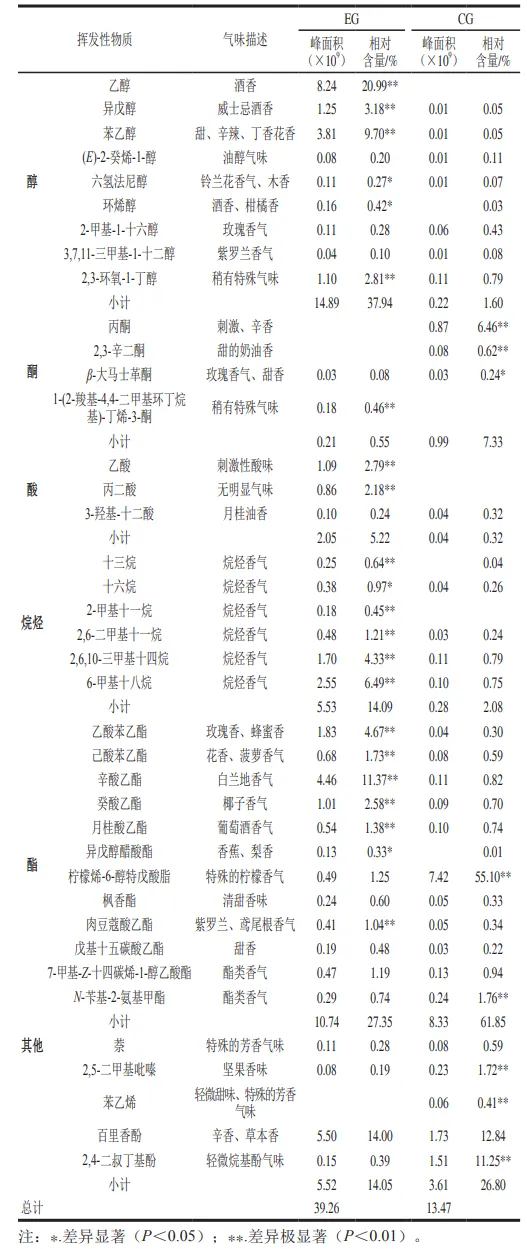 天麻经红茶菌发酵后,主要变化的酯类物质有乙酸苯乙酯(4.67%)、己酸苯乙酯(1.73%)、辛酸乙酯(11.37%)、癸酸乙酯(2.58%)等,这些酯类物质相对含量相较于对照组明显增加,使发酵液具有明显的果香味。而对照组中主要的风味物质是柠檬烯-6-醇特戊酸酯(55.10%),发酵后,该物质相对含量大大降低,推测该物质为天麻本身风味物质,发酵过程中被微生物降解。