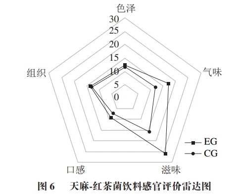 由图6可以看出,经红茶菌发酵后,实验组的口感、滋味、气味评分均优于对照组,色泽与组织状态上差别不大,均为棕色较清澈的液体,有少量沉淀。实验组有明显的甜香气,酸与醇味相协调,酸甜适中,而且几乎闻不出天麻的不愉快味,极大地改善天麻的可接受性,提高食用愉悦感。