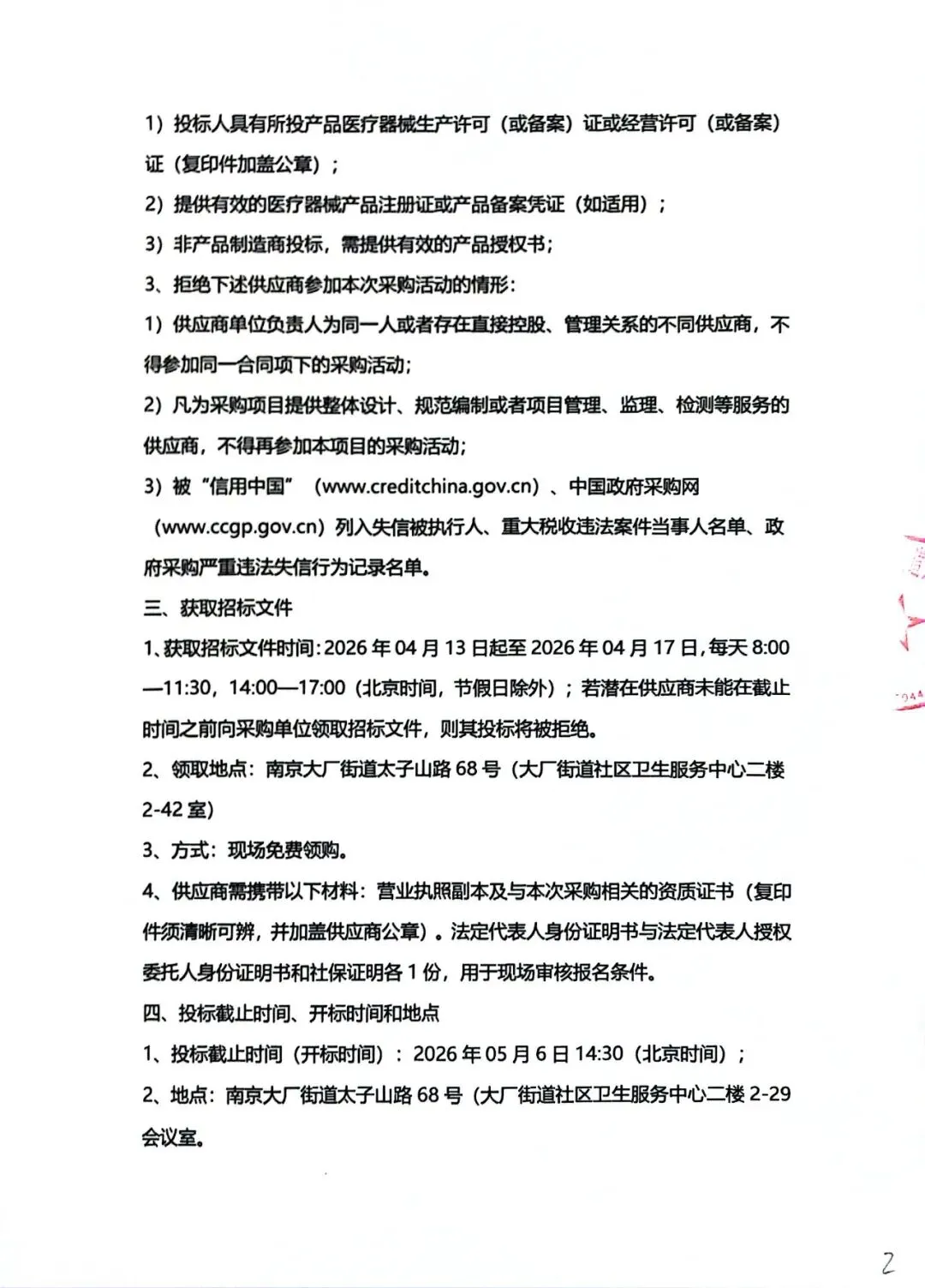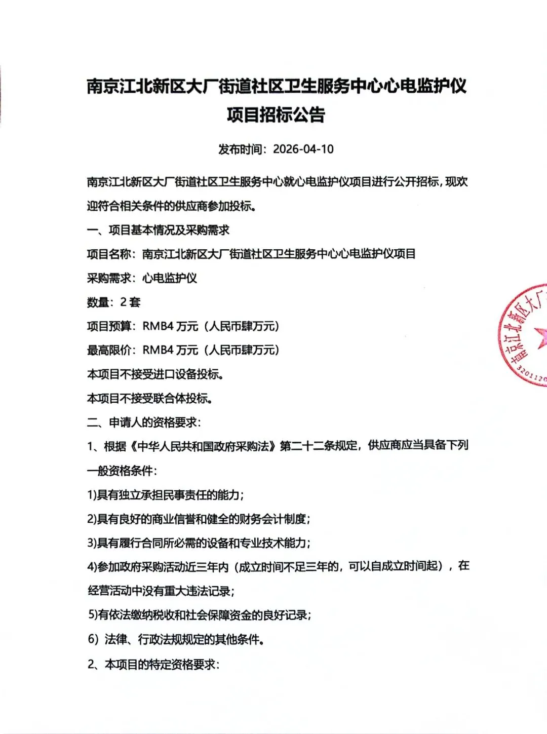 南京江北新区大厂街道社区卫生服务中心 心电监护仪项目招标公告
