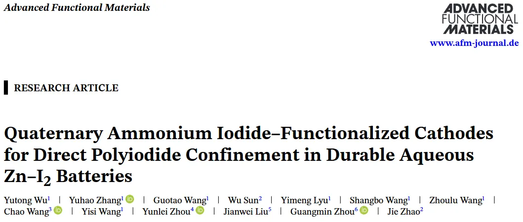 近日,来自南京工业大学的吴雨桐联合复旦大学赵捷、清华大学深圳国际研究生院周光敏、西安科技大学刘建伟等团队合作,在国际知名期刊 Advanced Functional Materials 上发表题为 “Quaternary Ammonium Iodide–Functionalized Cathodes for Direct Polyiodide Confinement in Durable Aqueous Zn–I2 Batteries” 的研究论文。该工作聚焦水系 Zn–I2 电池中长期存在的多碘化物穿梭与自放电难题,提出将卤素络合剂由电解液侧调控转向固相正极内部锚定,在反应界面原位构建更加稳定的多碘化物限域环境。通过对多种季铵盐的系统筛选,作者明确了 TBAI 在溶解性、络合能力与体系适配性之间的综合优势,并基于此实现了兼具60天超低自放电与1.7年超长循环寿命的 Zn–I2 电池性能,为耐久性 Zn–卤素电池的分子设计与正极构筑提供了新的研究框架。