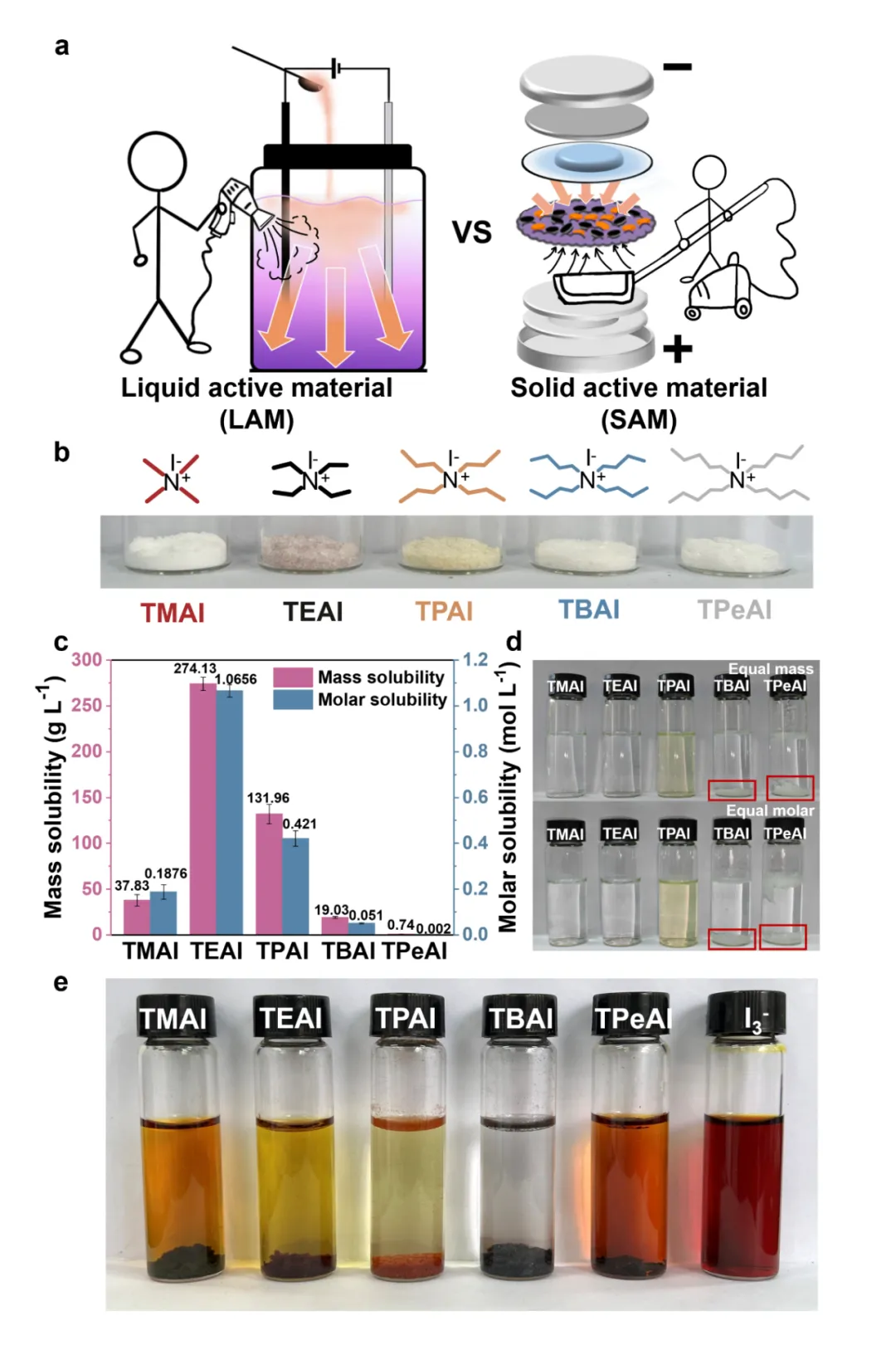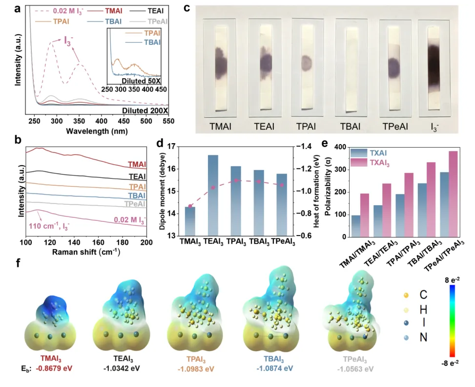 本文并未直接选取单一分子开展器件构筑,而是首先围绕多种季铵盐的水溶解性、多碘化物结合能力、分子结构特征及体系适配性进行了系统比较。结果表明,TBAI 既具有较低的水溶解度,能够较稳定地驻留于正极内部,又表现出最强的 I3− 络合与清除能力,可显著减少游离多碘化物的存在。进一步结合实验表征与理论分析可知,其优越性并非来源于某一单独参数,而是由溶解性、位阻效应、极化能力和分子堆积行为共同决定,体现出更优的综合平衡。