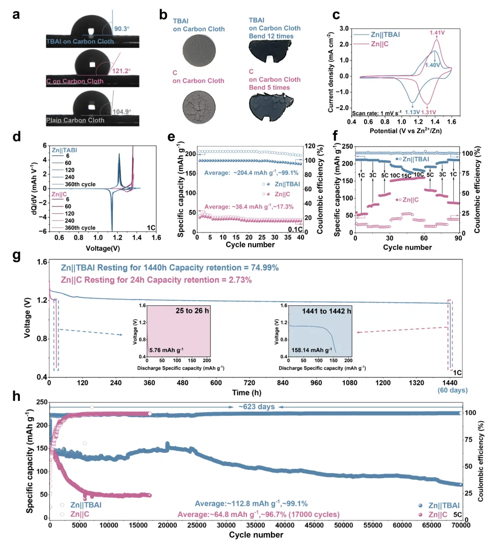 在完成分子筛选后,文章进一步考察了 TBAI 引入正极后的结构与性能响应。结果表明,TBAI 功能化正极在界面润湿性和机械完整性方面均明显优于对照体系,有助于维持稳定的电极结构和反应环境。更重要的是,这种结构与界面优势最终转化为极具代表性的器件表现:Zn||TBAI 在静置 1440 h(60 天) 后仍可保持 158.14 mAh g−1 的可逆容量,展现出极低的自放电水平;与此同时,其在 5 C 条件下可稳定循环 70000 圈(623 天,1.7年),平均容量保持在 112.8 mAh g−1,充分体现出该策略在储能保持能力和超长寿命方面的突出优势。
