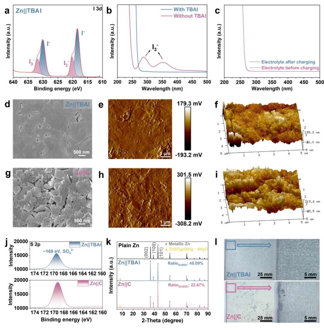 机理分析表明,TBAI 不仅能够将多碘化物更有效地限制在正极侧,而且还能同步改善锌负极的沉积行为与界面稳定性。AFM、XPS、XRD 与光学显微结果均显示,Zn||TBAI 对应的锌表面更加平整,副产物积累更少,并呈现更明显的 Zn (002) 择优沉积特征。这说明该策略并非仅在正极端发挥作用,而是通过抑制多碘化物跨界迁移,进一步减轻了负极腐蚀、绝缘副产物生成及无序沉积问题,体现出对正负极双界面的协同稳定效应。