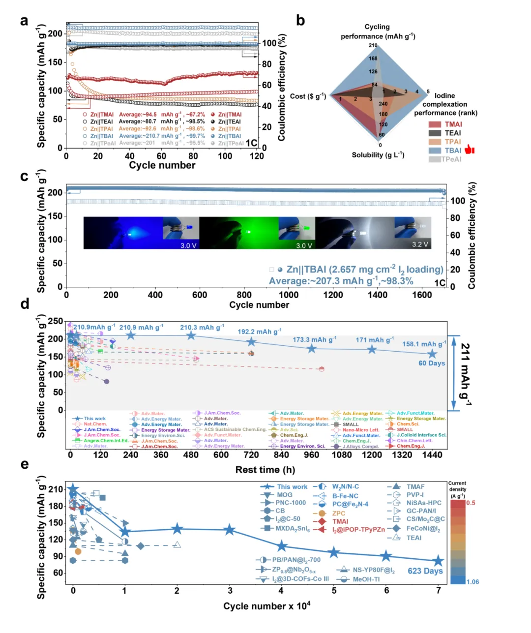 图5. TBAI 功能化 Zn–I2 电池的实用化性能展示与文献对比。