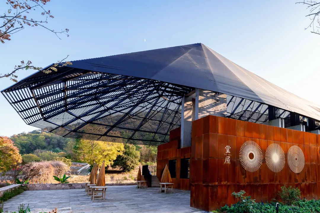 堂屋以巨大的斗笠造型漂浮在山谷里,适合各类会议沙龙、中小型展览,精致纯雅的内部空间,别具一格。
