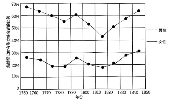 13.如图反映的是1754-1845年英国兰开夏地区(著名工业区)结婚青年的识字率。影响兰开夏地区结婚青年识字率变动的主要原因是()