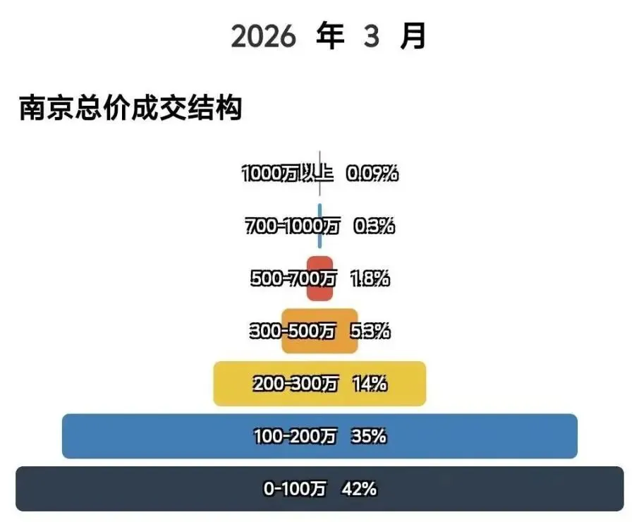从2026年3月南京总价成交结构可以看出,总价100万以下的二手房,占比42%,200万以下的二手房,占比高达77%。