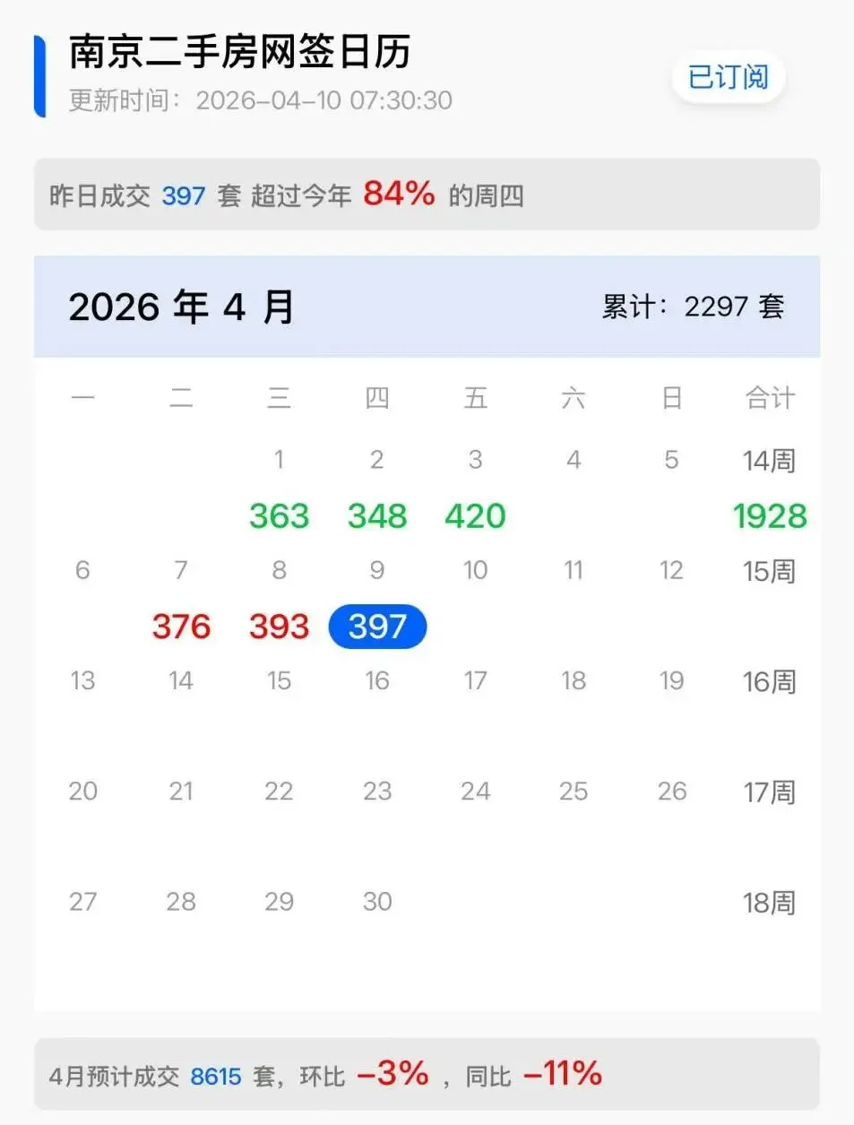 据楼市日历,4月,南京二手房网签数量达2297套,预计全月成交8615套,同比下降11%。