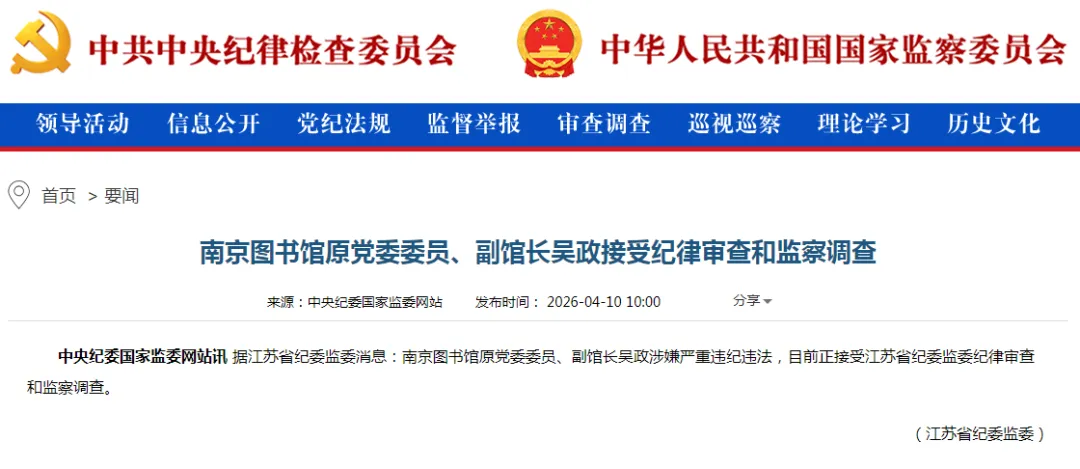 2026年4月10日,据江苏省纪委监委消息,吴政涉嫌严重违纪违法,接受江苏省纪委监委纪律审查和监察调查。