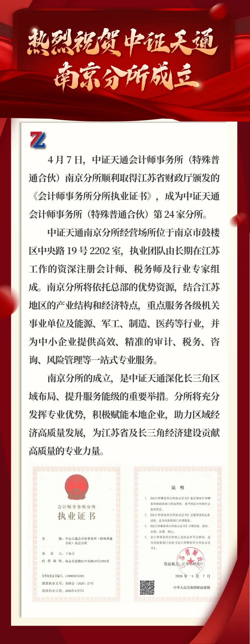 热烈祝贺中证天通南京分所成立