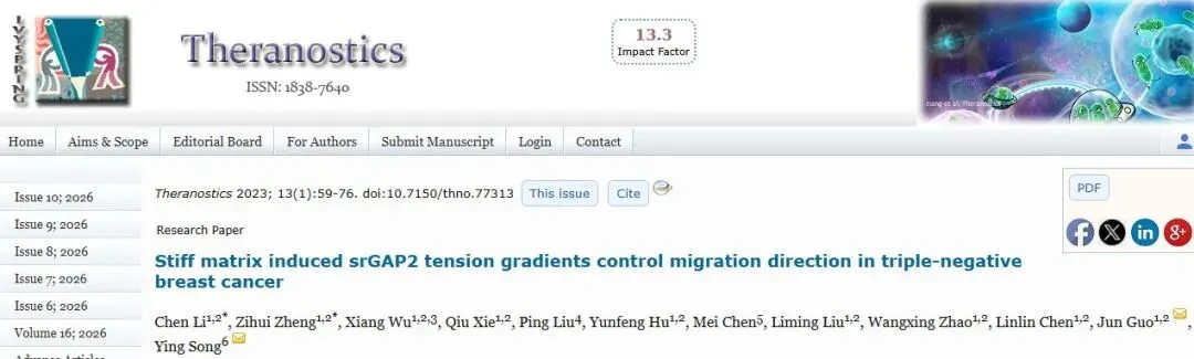 由南京中医药大学与江苏省人民医院联合在Theranostics期刊(IF 13.3)上发表的题为Stiff matrix induced srGAP2 tension gradients control migration direction in triple-negative breast cancer的论文,论文第一作者为南京中医药大学的Chen Li、Zihui Zheng,通讯作者为南京中医药大学的Jun Guo、江苏省人民医院的Ying Song。该研究聚焦三阴性乳腺癌的迁移方向调控机制,涉及基质刚度、srGAP2蛋白张力梯度等前沿内容,获得了3项基金支持。然而,发表两年后有读者提出质疑,指出论文实验数据存在图片重复。 doi:10.7150/thno.77313
