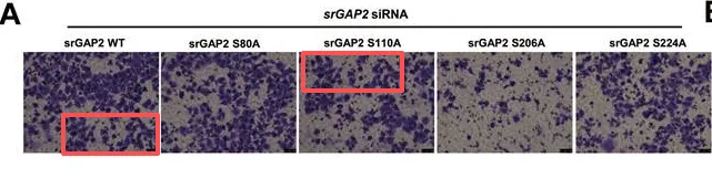 论文图6A采用Transwell侵袭实验检测TNBC 细胞的侵袭能力,遭读者质疑srGAP2-WT细胞与srGAP2-S110A细胞面板之间存在疑似相互重复区域(见图片红色标记)。