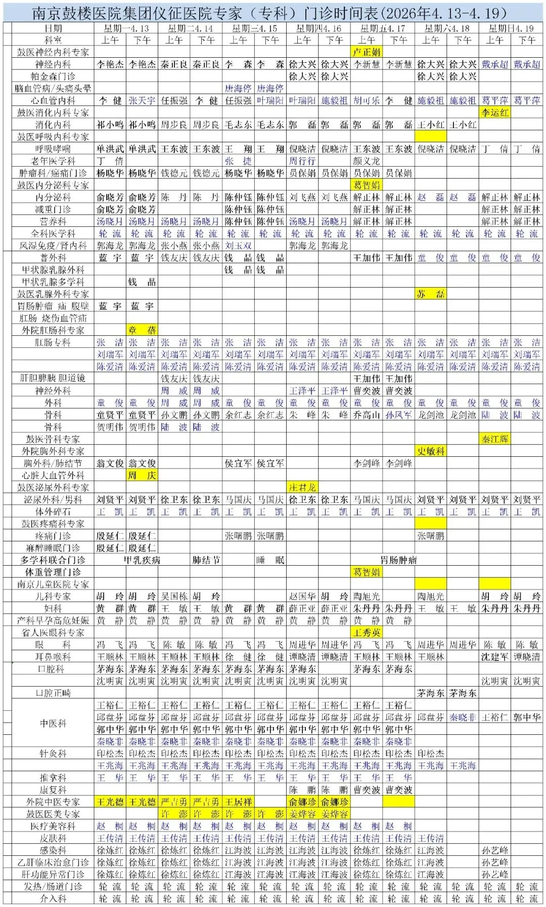 南京鼓楼医院集团仪征医院4月13日——4月19日门诊排班表