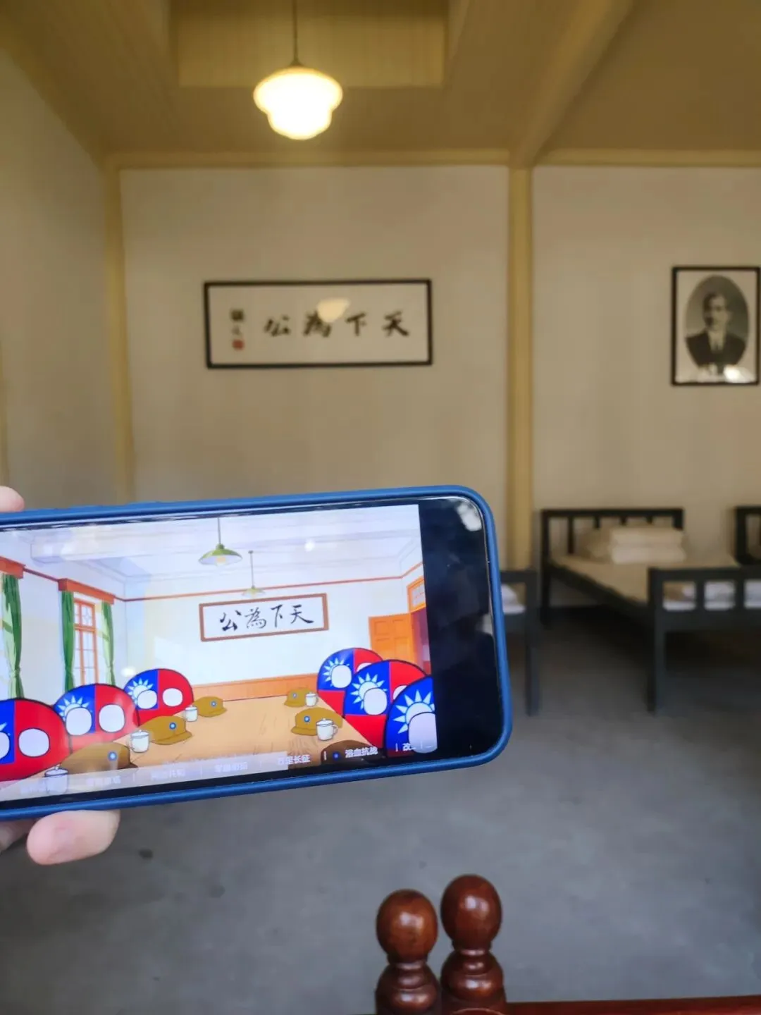 旁边是卫士室,看见这个布局小老王给我们看波兰球的历史视频,里面有一个画面的装修和这个布局很像。路人甲看见这个画面后说了句:哇,国民党旗。我们内心一顿鄙视,懂不懂历史啊,这是第二代的民国国旗。