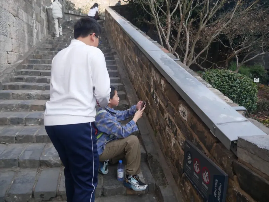 我们该登上城墙了。小老王又看见砖上的刻字了。,记录下这个瞬间。听说南京城墙上的城砖有一位工匠的名字是刘德华,不知道在哪里。
