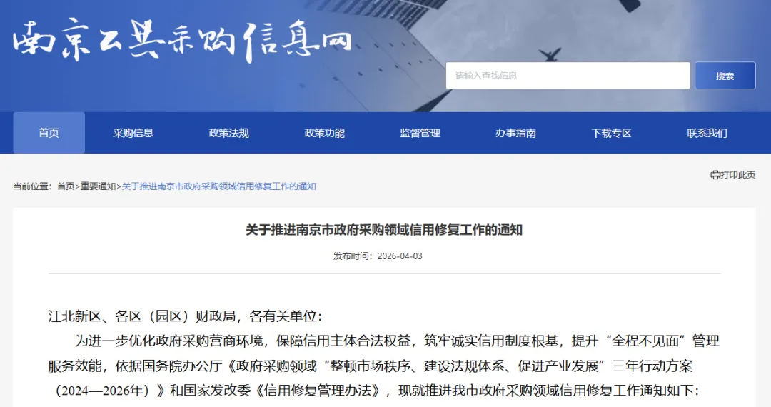为进一步优化政府采购营商环境,保障信用主体合法权益,筑牢诚实信用制度根基,提升“全程不见面”管理服务效能,近日,南京市财政局发布《关于推进南京市政府采购领域信用修复工作的通知》。