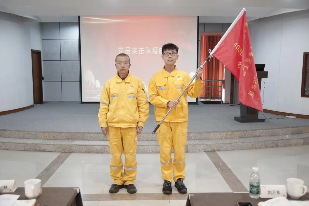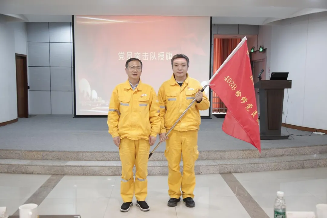 会议举行了庄重的党员突击队授旗仪式。在激昂的《中国人民解放军进行曲》中,副总经理田林、技术总监刘万东分别为设备部党员突击队、发电部党员突击队授旗。队长张望、刘洋接旗并表态,表示将以党旗为引领,以坚定信念、过硬作风、务实行动冲锋在前、勇挑重担,坚决打赢检修攻坚战。