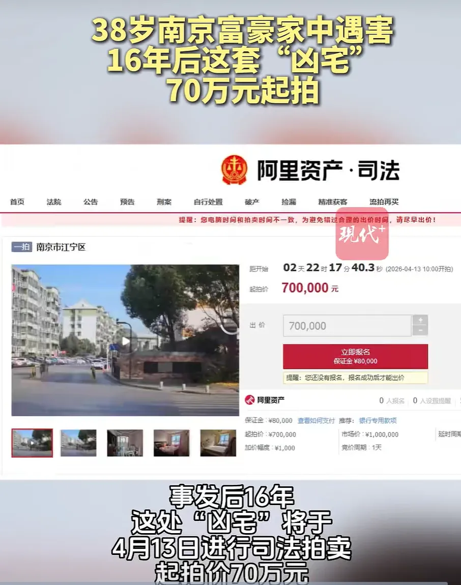 2010年,现代快报曾报道了南京市江宁区一身价过亿的房地产老总刘某,在家中遭人杀害一案。事发后16年,这处“凶宅”将于4月13日进行司法拍卖,起拍价70万元。截至4月10日12时,此次拍卖暂无人报名参拍。这处房产是否能顺利拍出?记者将持续关注。