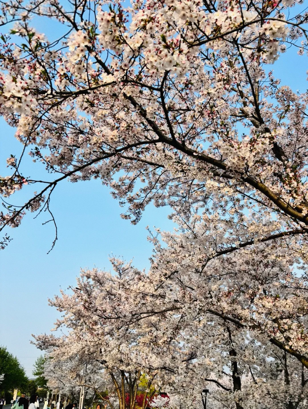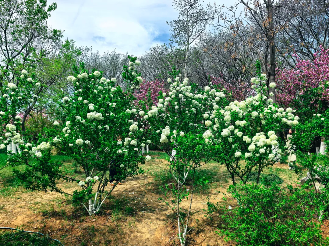 进入园内,樱花如云似雪,海棠粉白相间,桃花灼灼其华;绣球花也成团簇拥,蓝、紫、粉各色花球铺满步道旁。