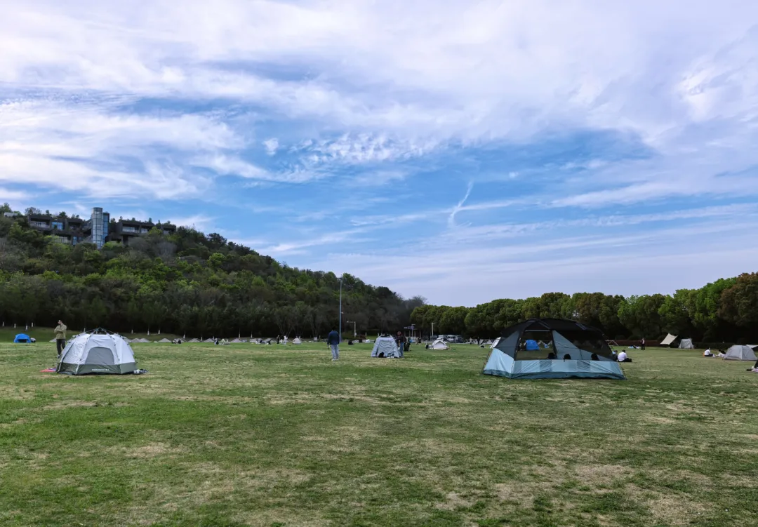 公园西侧有一片开阔平坦的大草坪,养护得极好,视野开阔,是公园最受欢迎的区域之一。不少人带着帐篷、野餐垫,在草坪上露营、野餐;天空中飘满各色风筝,孩子们在草坪上追逐嬉戏。