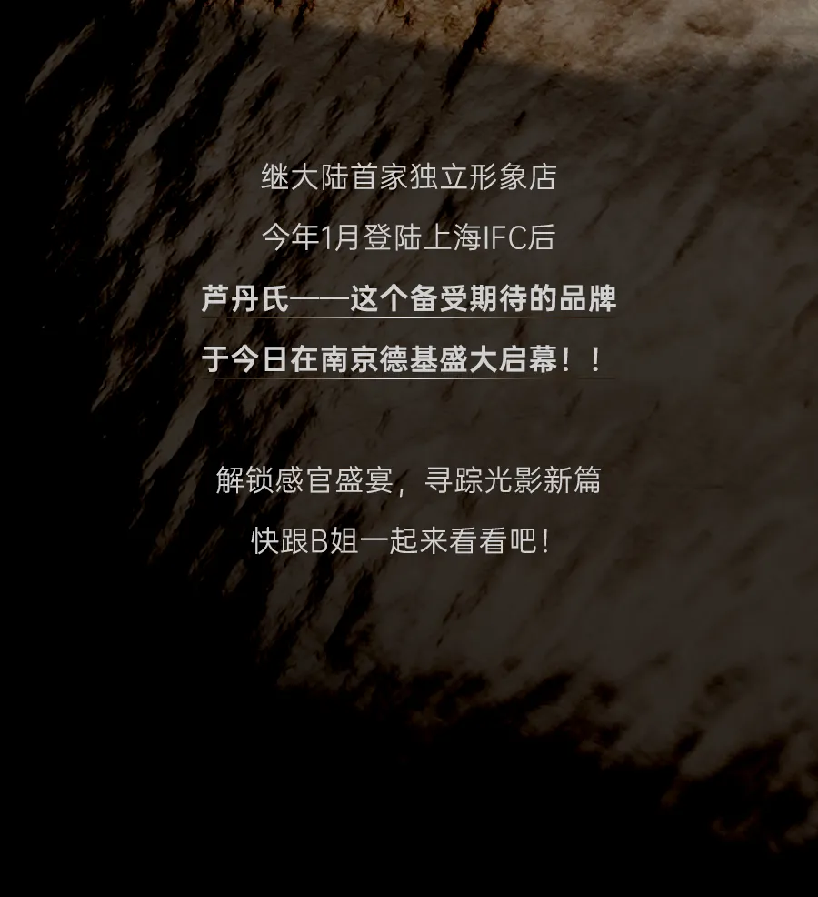 六朝古都的深厚底蕴、金陵烟雨的朦胧诗意,与芦丹氏骨子里的“艺术感”、“故事性”和“神秘气质”相契合,南京德基精品店延续了芦丹氏一贯的空间美学,以曜黑、米白为主色调,打造充满沉浸感与仪式感的艺术沙龙。