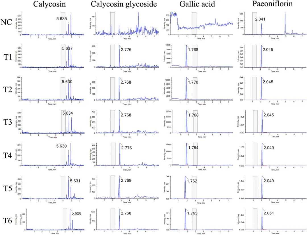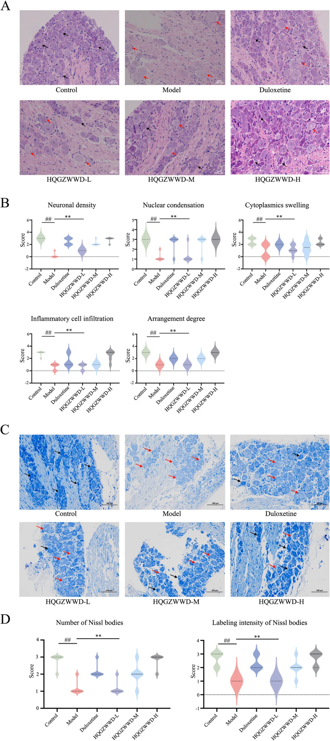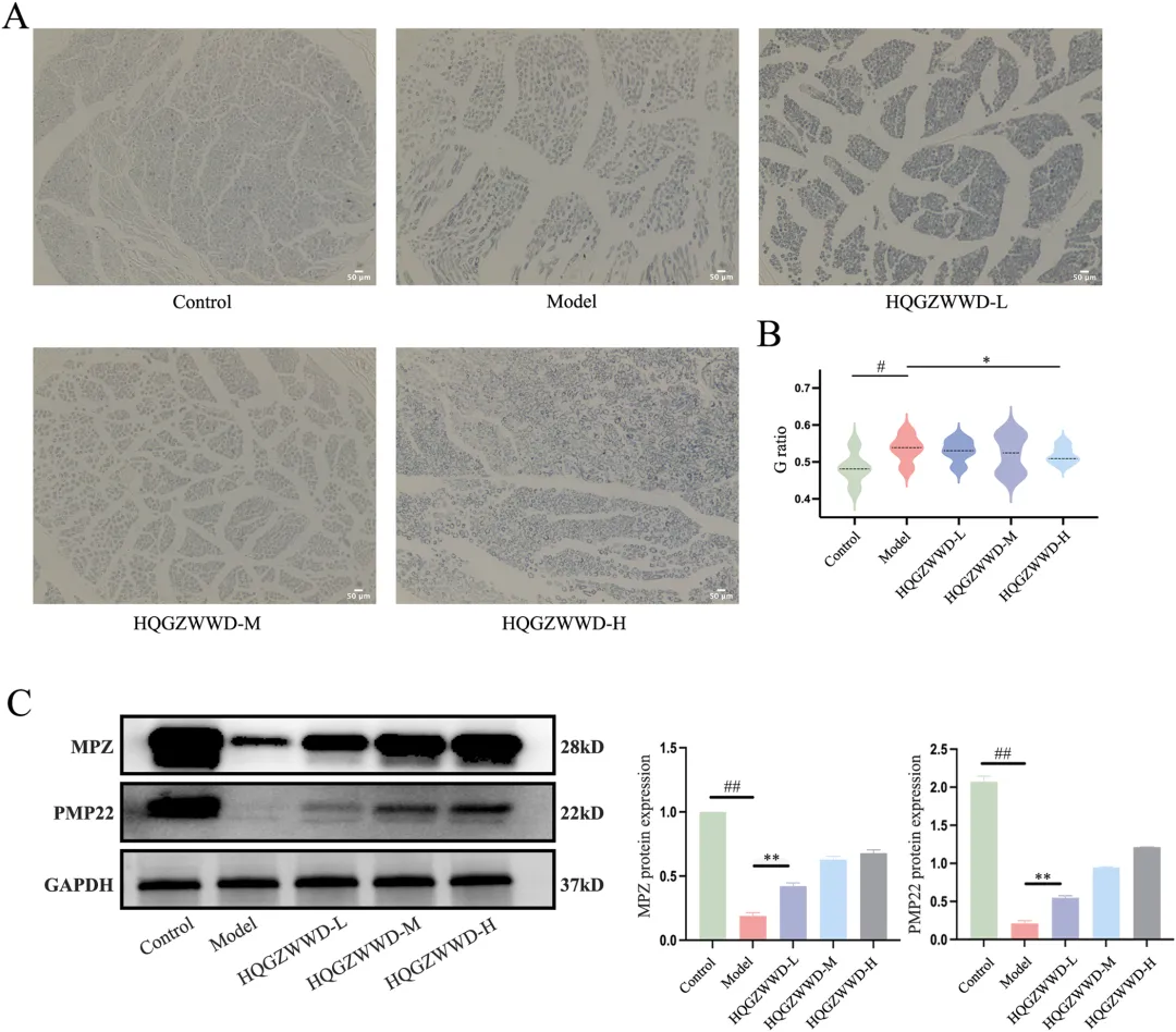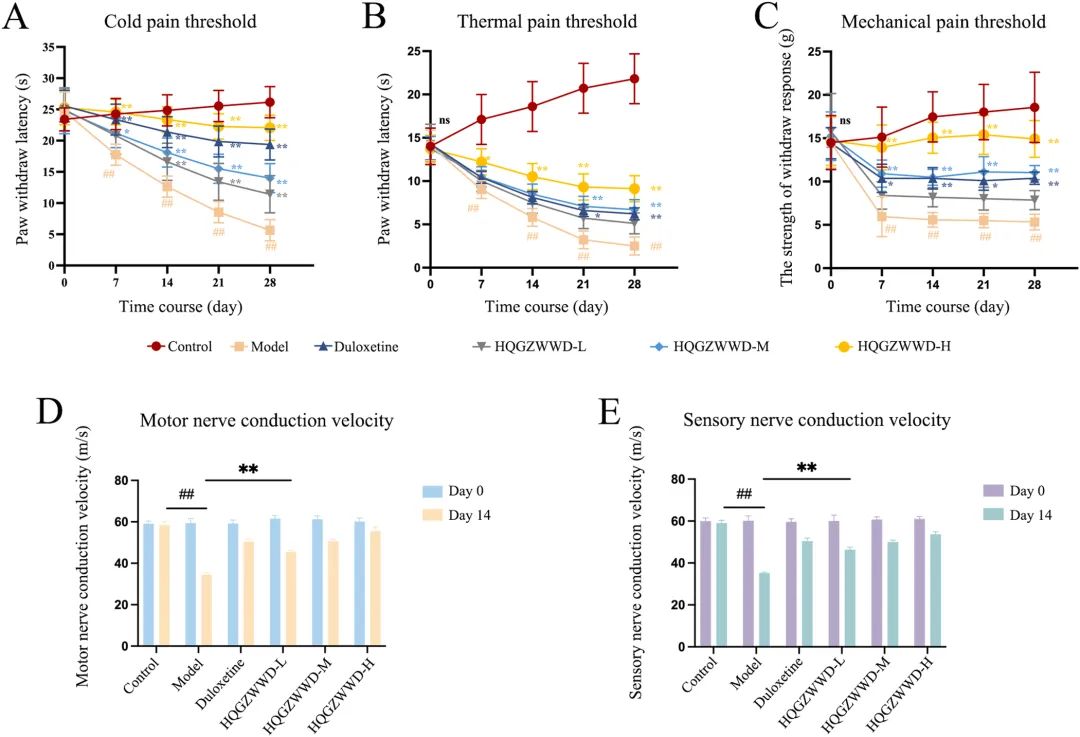 中药复方的质量控制是确保临床疗效一致性的基础。研究采用超高效液相色谱-四极杆飞行时间质谱(UPLC-QTOF-MS)技术对黄芪桂枝五物汤进行了全面的化学成分分析,通过总离子色谱图(TIC)检测,基于质谱碎片和文献数据,共鉴定出66种主要化合物。分析结果显示,黄芪桂枝五物汤的主要活性成分包括没食子酸、5-羟甲基糠醛、芍药苷、槲皮素葡萄糖苷、桂皮酸、肉桂醛和姜辣醇等,这些成分涵盖了黄酮类、萜类、酚酸类等多种结构类型,体现了中药复方多成分协同作用的特点。该研究不仅为黄芪桂枝五物汤的质量标准建立提供了科学依据,也为后续体内分布研究和作用机制探讨奠定了物质基础。药物成分能否吸收入血是发挥其系统作用的前提条件。研究者从黄芪桂枝五物汤中选取了12种含量较高的单体化合物,采用UPLC-MS技术检测其在大鼠血浆中的分布情况。结果显示,血浆中可检测到4种成分,分别为没食子酸、大豆素、大豆素苷和芍药苷,而其余8种成分未检出。这一发现表明,黄芪桂枝五物汤中的部分活性成分能够被机体有效吸收进入血液循环,从而可能对全身多个器官系统产生药理作用。血浆中可检测到的成分种类和浓度信息,为理解该方剂的整体作用特点提供了重要的药代动力学依据,也提示这些入血成分可能是发挥疗效的关键物质基础。图3. 利用UPLC-MS检测药物成分在血浆中的分布 利用 UPLC-MS 检测药物成分在背根神经节中的分布背根神经节(Dorsal Root Ganglion, DRG)是周围神经系统的重要组成部分,是感觉神经元胞体聚集的部位,也是奥沙利铂诱导神经毒性的主要靶点之一。药物成分能否穿透血-神经屏障、在DRG组织中达到有效浓度,直接关系到其对OIPN的治疗效果。研究者在同一实验条件下,进一步检测了上述12种成分在DRG组织中的分布特征。结果显示,共有5种成分可被检测到,分别为没食子酸、大豆素、大豆素苷、槲皮素和芍药苷,其中槲皮素在血浆中未检出但在DRG组织中可检测到,提示该成分可能具有较好的神经组织靶向性。这一发现具有重要的科学意义,表明黄芪桂枝五物汤中的多种活性成分能够直接作用于病变神经组织,为后续机制研究提供了明确的靶点线索。图4. 利用UPLC-MS检测药物成分在背根神经节中的分布 黄芪桂枝五物汤干预对 OIPN 建模后动物行为的影响为系统评价黄芪桂枝五物汤的防治效果,研究者建立了经典的OIPN大鼠模型,通过腹腔注射奥沙利铂(4 mg/kg,每周前两天给药,连续4周)模拟临床化疗情境,并设置低、中、高三个剂量组(1.3、2.6、3.9 g/kg/d)进行干预,同时以度洛西汀作为阳性对照药物。行为学评估涵盖了冷痛敏感性、热痛敏感性、机械痛敏感性及坐骨神经传导速度等多个维度(图4)。结果显示,在干预第7天,模型组大鼠冷痛阈值显著降低,而各剂量黄芪桂枝五物汤组均呈现剂量依赖性的冷痛阈值升高;至第14天,各剂量组与模型组相比均具有极显著差异。热痛敏感性测试表明,模型组在第7天即出现显著降低,而中、高剂量组在第21天显著改善。机械痛敏感性测试中,模型组第7天显著降低,中、高剂量组同步显示出显著改善。更为重要的是,坐骨神经传导速度检测显示,模型组在第14天运动神经和感觉神经传导速度均显著下降,而各剂量黄芪桂枝五物汤组均显著改善。这些行为学和神经电生理学结果一致表明,黄芪桂枝五物汤能够有效预防和治疗OIPN,且呈现良好的剂量-效应关系。图5. 黄芪桂枝五物汤干预对OIPN建模后动物行为的影响 黄芪桂枝五物汤干预后各组大鼠背根神经节组织染色切片分析组织病理学检查是评估神经损伤和保护效果的"金标准"之一。研究者对DRG组织进行了苏木精-伊红(HE)染色和尼氏(Nissl)染色分析。HE染色从神经元密度、核固缩、胞质肿胀、炎性细胞浸润和细胞排列五个维度进行病理评分,结果显示对照组DRG组织结构致密、形态正常,而模型组组织松散,神经元核固缩和胞质肿胀明显,伴显著炎性细胞浸润和细胞排列紊乱;黄芪桂枝五物汤干预后,上述病理改变明显改善。Nissl染色进一步显示,对照组神经元尼氏体丰富、染色深、分布均匀、排列整齐,而模型组神经元稀疏、密度降低、核固缩、尼氏体减少且染色浅;经黄芪桂枝五物汤干预后,神经元密度增加,核固缩减轻,细胞间隙缩小,排列更紧密,尼氏体增多且染色加深。这些组织学改变从形态学角度证实了黄芪桂枝五物汤对DRG神经元的直接保护作用。图6. 黄芪桂枝五物汤干预后各组大鼠背根神经节组织染色切片分析 黄芪桂枝五物汤干预后各组动物背根神经节组织的代谢组学分析代谢组学能够系统反映生物体内源性代谢物的变化,为揭示药物作用机制提供重要线索。研究者采用UPLC-MS技术对DRG组织进行了非靶向代谢组学分析(图6),通过主成分分析(PCA)和偏最小二乘判别分析(PLS-DA)发现三组样本代谢谱明显分离,提示OIPN导致显著的代谢紊乱,而黄芪桂枝五物汤干预可部分逆转这一改变。基于p<0.05和fold change>1.2的标准,共筛选出14种差异代谢物,包括牛磺酸、葡萄糖-6-磷酸、6-磷酸葡萄糖酸、O-磷脂酰乙醇胺、尿素、肌酸、β-丙氨酸、天冬氨酸、β-甘露糖苷酸、苹果酸等上调代谢物,以及来苏糖、缩醛磷脂B环氧化物、塔乐糖-2等下调代谢物。通路富集分析显示,这些差异代谢物主要富集于牛磺酸和低牛磺酸代谢、β-丙氨酸代谢通路。牛磺酸作为含硫氨基酸,具有调节神