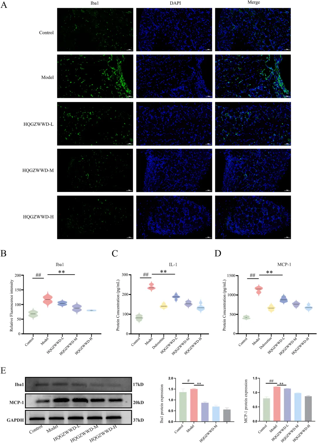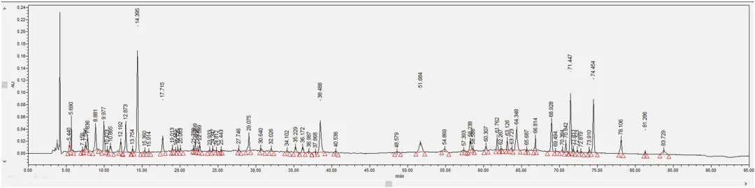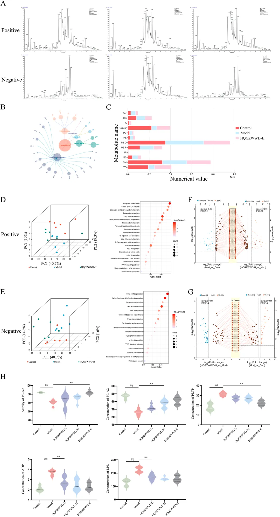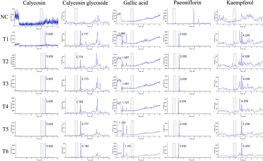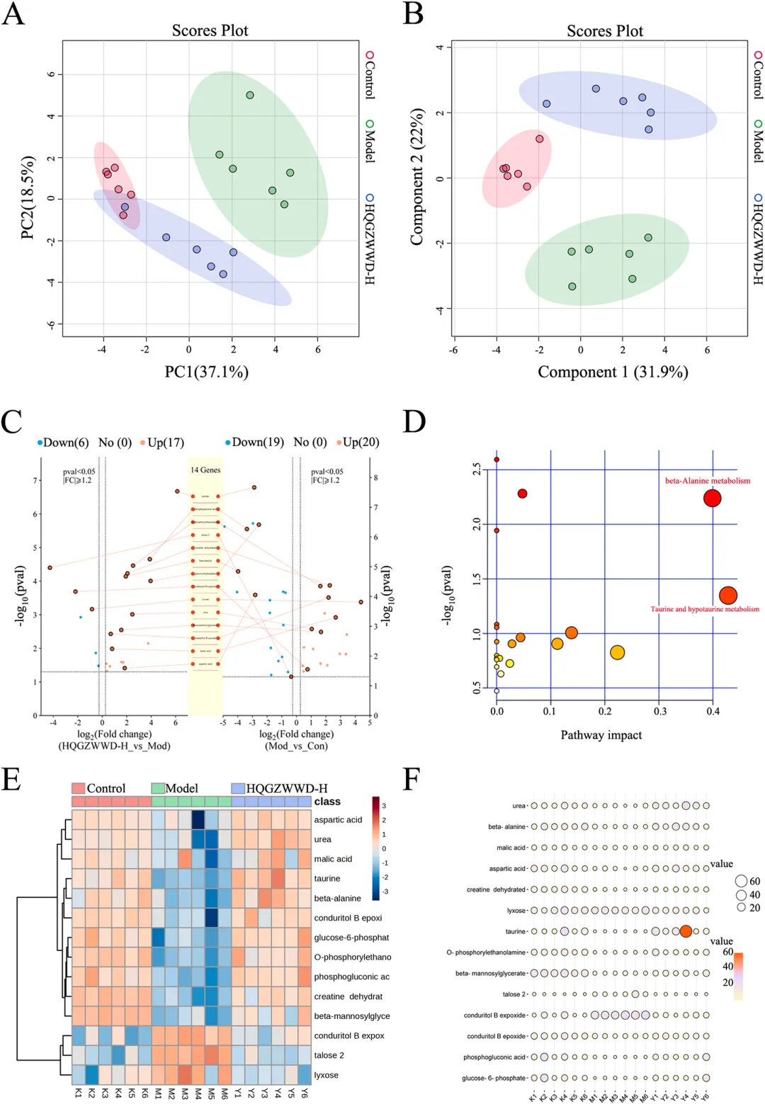 中药复方的质量控制是确保临床疗效一致性的基础。研究采用超高效液相色谱-四极杆飞行时间质谱(UPLC-QTOF-MS)技术对黄芪桂枝五物汤进行了全面的化学成分分析,通过总离子色谱图(TIC)检测,基于质谱碎片和文献数据,共鉴定出66种主要化合物。分析结果显示,黄芪桂枝五物汤的主要活性成分包括没食子酸、5-羟甲基糠醛、芍药苷、槲皮素葡萄糖苷、桂皮酸、肉桂醛和姜辣醇等,这些成分涵盖了黄酮类、萜类、酚酸类等多种结构类型,体现了中药复方多成分协同作用的特点。该研究不仅为黄芪桂枝五物汤的质量标准建立提供了科学依据,也为后续体内分布研究和作用机制探讨奠定了物质基础。药物成分能否吸收入血是发挥其系统作用的前提条件。研究者从黄芪桂枝五物汤中选取了12种含量较高的单体化合物,采用UPLC-MS技术检测其在大鼠血浆中的分布情况。结果显示,血浆中可检测到4种成分,分别为没食子酸、大豆素、大豆素苷和芍药苷,而其余8种成分未检出。这一发现表明,黄芪桂枝五物汤中的部分活性成分能够被机体有效吸收进入血液循环,从而可能对全身多个器官系统产生药理作用。血浆中可检测到的成分种类和浓度信息,为理解该方剂的整体作用特点提供了重要的药代动力学依据,也提示这些入血成分可能是发挥疗效的关键物质基础。图3. 利用UPLC-MS检测药物成分在血浆中的分布 利用 UPLC-MS 检测药物成分在背根神经节中的分布背根神经节(Dorsal Root Ganglion, DRG)是周围神经系统的重要组成部分,是感觉神经元胞体聚集的部位,也是奥沙利铂诱导神经毒性的主要靶点之一。药物成分能否穿透血-神经屏障、在DRG组织中达到有效浓度,直接关系到其对OIPN的治疗效果。研究者在同一实验条件下,进一步检测了上述12种成分在DRG组织中的分布特征。结果显示,共有5种成分可被检测到,分别为没食子酸、大豆素、大豆素苷、槲皮素和芍药苷,其中槲皮素在血浆中未检出但在DRG组织中可检测到,提示该成分可能具有较好的神经组织靶向性。这一发现具有重要的科学意义,表明黄芪桂枝五物汤中的多种活性成分能够直接作用于病变神经组织,为后续机制研究提供了明确的靶点线索。图4. 利用UPLC-MS检测药物成分在背根神经节中的分布 黄芪桂枝五物汤干预对 OIPN 建模后动物行为的影响为系统评价黄芪桂枝五物汤的防治效果,研究者建立了经典的OIPN大鼠模型,通过腹腔注射奥沙利铂(4 mg/kg,每周前两天给药,连续4周)模拟临床化疗情境,并设置低、中、高三个剂量组(1.3、2.6、3.9 g/kg/d)进行干预,同时以度洛西汀作为阳性对照药物。行为学评估涵盖了冷痛敏感性、热痛敏感性、机械痛敏感性及坐骨神经传导速度等多个维度(图4)。结果显示,在干预第7天,模型组大鼠冷痛阈值显著降低,而各剂量黄芪桂枝五物汤组均呈现剂量依赖性的冷痛阈值升高;至第14天,各剂量组与模型组相比均具有极显著差异。热痛敏感性测试表明,模型组在第7天即出现显著降低,而中、高剂量组在第21天显著改善。机械痛敏感性测试中,模型组第7天显著降低,中、高剂量组同步显示出显著改善。更为重要的是,坐骨神经传导速度检测显示,模型组在第14天运动神经和感觉神经传导速度均显著下降,而各剂量黄芪桂枝五物汤组均显著改善。这些行为学和神经电生理学结果一致表明,黄芪桂枝五物汤能够有效预防和治疗OIPN,且呈现良好的剂量-效应关系。图5. 黄芪桂枝五物汤干预对OIPN建模后动物行为的影响 黄芪桂枝五物汤干预后各组大鼠背根神经节组织染色切片分析组织病理学检查是评估神经损伤和保护效果的"金标准"之一。研究者对DRG组织进行了苏木精-伊红(HE)染色和尼氏(Nissl)染色分析。HE染色从神经元密度、核固缩、胞质肿胀、炎性细胞浸润和细胞排列五个维度进行病理评分,结果显示对照组DRG组织结构致密、形态正常,而模型组组织松散,神经元核固缩和胞质肿胀明显,伴显著炎性细胞浸润和细胞排列紊乱;黄芪桂枝五物汤干预后,上述病理改变明显改善。Nissl染色进一步显示,对照组神经元尼氏体丰富、染色深、分布均匀、排列整齐,而模型组神经元稀疏、密度降低、核固缩、尼氏体减少且染色浅;经黄芪桂枝五物汤干预后,神经元密度增加,核固缩减轻,细胞间隙缩小,排列更紧密,尼氏体增多且染色加深。这些组织学改变从形态学角度证实了黄芪桂枝五物汤对DRG神经元的直接保护作用。图6. 黄芪桂枝五物汤干预后各组大鼠背根神经节组织染色切片分析 黄芪桂枝五物汤干预后各组动物背根神经节组织的代谢组学分析代谢组学能够系统反映生物体内源性代谢物的变化,为揭示药物作用机制提供重要线索。研究者采用UPLC-MS技术对DRG组织进行了非靶向代谢组学分析(图6),通过主成分分析(PCA)和偏最小二乘判别分析(PLS-DA)发现三组样本代谢谱明显分离,提示OIPN导致显著的代谢紊乱,而黄芪桂枝五物汤干预可部分逆转这一改变。基于p<0.05和fold change>1.2的标准,共筛选出14种差异代谢物,包括牛磺酸、葡萄糖-6-磷酸、6-磷酸葡萄糖酸、O-磷脂酰乙醇胺、尿素、肌酸、β-丙氨酸、天冬氨酸、β-甘露糖苷酸、苹果酸等上调代谢物,以及来苏糖、缩醛磷脂B环氧化物、塔乐糖-2等下调代谢物。通路富集分析显示,这些差异代谢物主要富集于牛磺酸和低牛磺酸代谢、β-丙氨酸代谢通路。牛磺酸作为含硫氨基酸,具有调节神