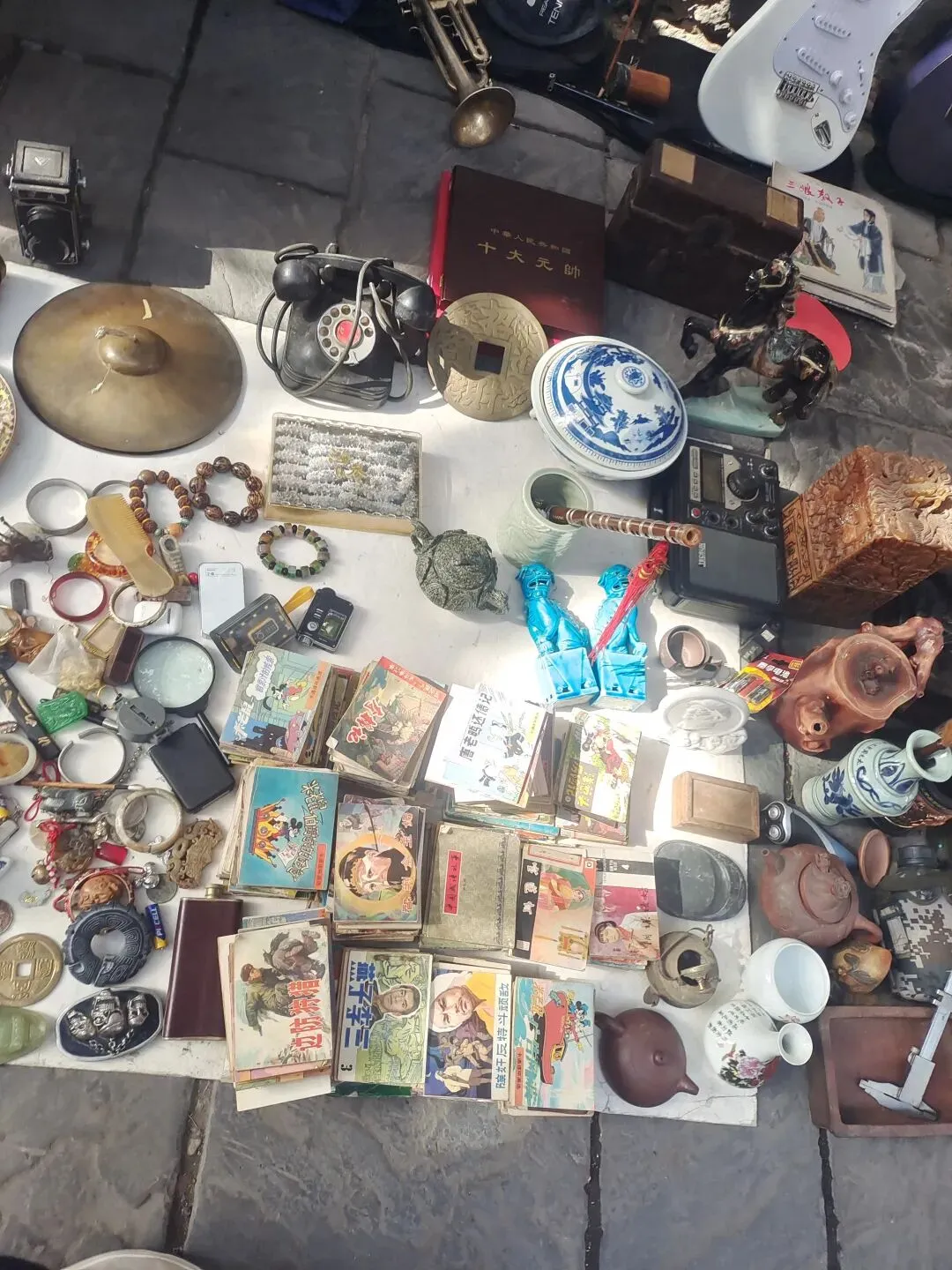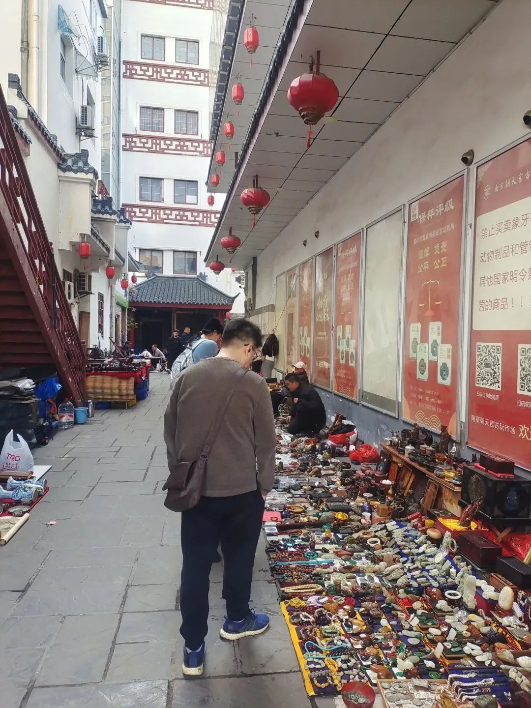 清明节来到了南京游玩,这是热闹的新街口,这里。树立着孙中山先生的铜像仿佛孙中山先生一直在看着这座城市,一瞬间,好温柔。 因为清明节第二天是星期天,所以南京古玩早市还是有的,我打算去朝天宫看看,这不坐地铁坐了很好十几站(南京住宿太贵了),到了朝天宫古玩市场。 今天天气真的好不错,上一次来到朝天宫古玩市场,还是在2021年,当时在无锡的时候,一晃5年过去了,还是感叹时间飞快,竟然有些不认识路了,只是依稀记得在一个小巷子里可以进入古玩市场。 走了10分钟,找到了古玩市场的入口,今天可能是假期的原因,所以古玩市场上略显冷清,但是还是有很多摆摊的,买货的基本上没有。 我往前走了走,基本上两边都是卖工艺品的,没有看到适合我的摊位。 这就是现在大部分城市古玩市场的尴尬所在,基本上是很少有真货的。即所谓有真货,也都是很普通的,也都是别人挑剩下的,现在很多精品的东西都是藏家之间的交流。 这里的古玩市场是在1楼摆摊,然后大部分在楼上摆摊,这样无论刮风下雨都淋不住。 好像这里是卖一些老瓷器老陶器的,看到了几个龙瓦,不知道是不是明代的遗存,因为明代南京作为南直隶,是明王朝的重镇。 这里还有很多小人书,可以说古玩市场可以带孩子过来闲逛,但真正的去买货,现在还是需要去一些店里面,虽然价格可能高一点,但是东西就好一点,地摊上基本上买不到什么太好的东西了。 我看到了一个老大爷在挑铜板,老板要10块钱一枚,他挑了半天,挑了5枚,最终给老家老板只还价20,老板直接没卖,我拿起来看了看,因为看不懂真假,所以我就放下了。 坐电梯上了三楼,这里人还挺多的,我感觉今天好像买不到什么古钱币之类的,因为最近我对古钱币的兴趣也并不是很大。普通的都有了,除非品相特别好的,自己想买一下,但是在地摊上能碰见品相特别好的概率还是挺少的。最近我比较喜欢银元,像通货的大头小头,都是我想购买的一些品种,可惜在地摊上基本上买不到真的。 果然逛了一圈,还是没买到喜欢的东西,基本上全是我看不懂的一些小玩意儿,钱币基本上没有,或者我看到了一个摊位,老板要价太高了,一个民国的铜帽徽要价竟然要150元,我卖也就卖五六十。 我下楼到古玩店里逛了逛,竟然还看到了本地的窑口,界首窑,这是典型的清末民国的东西,但是我没有问价,因为这个大的瓶子带着确实不大方便。 看到店里的老板摆出的银元,我驻足了很长时间,挨个看了看,自己都特别的喜欢,可惜老板没有开门,很多假期都不在。 我出了古玩市场,沿街还有一些钱币店进去之后和老板唠唠,买了一些民国的纸币。南京作为民国时期的首都,这种东西肯定不在少数,于是我就挑了不少,花了四五百块钱,拿下了这一批民国纸币。品种也挺多的,最近在筹备自己的钱币工作室,所以需要这些东西呢去衬托一下,东西不贵。