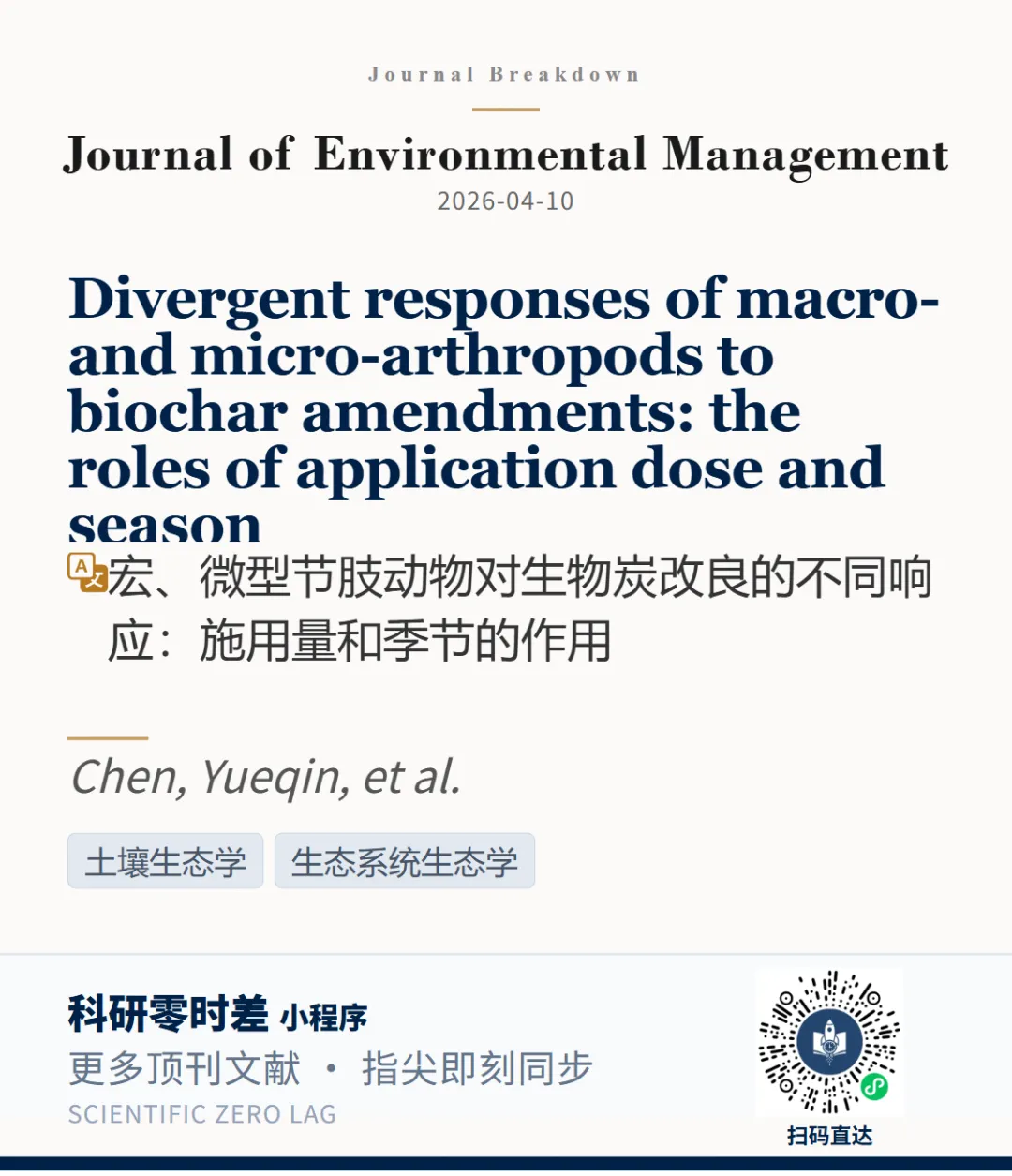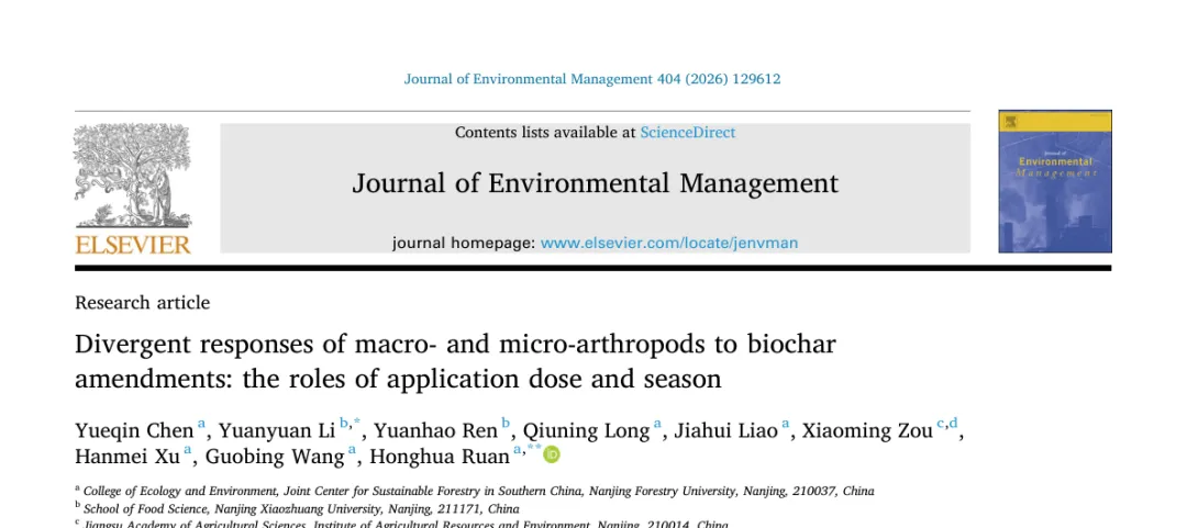 我们通过小程序科研零时差追踪到: Journal of Environmental Management近期发表题为“Divergent responses of macro- and micro-arthropods to biochar amendments: the roles of application dose and season”的文章。第一单位为南京林业大学。