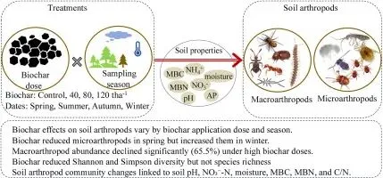 本研究表明,生物炭对土壤节肢动物群落的影响具有显著的季节依赖性和类群特异性,并在农艺效益与土壤生物多样性之间可能存在权衡。
