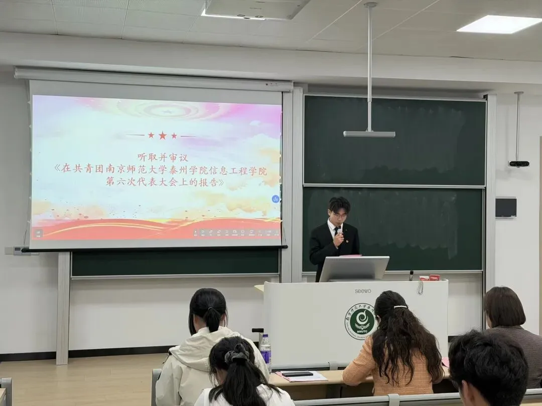 团总支学生副书记董学斌作《在共青团南京师范大学泰州学院信息工程学院第六次团员代表大会上的报告》。报告全面回顾了我院团总支在思想引领、志愿服务等方面取得的成绩与实践经验,提出了今后我院团总支工作的目标与任务,为团学工作的开展指明了清晰方向。大会审议并通过了该工作报告。