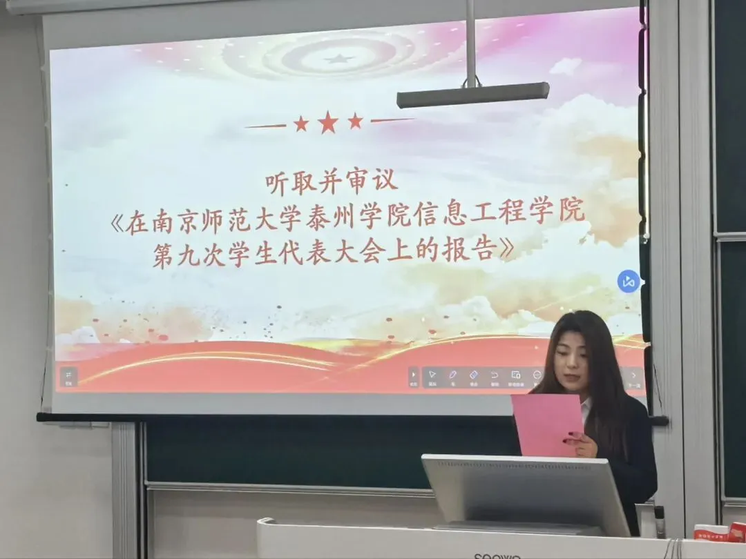 学生会主席应荟平作《在南京师范大学泰州学院信息工程学院第九次学生代表大会上的报告》。报告梳理了我院学生会在思想引领、校园文化生活等方面的工作成效,展望了未来学生会的发展方向与工作重点。大会审议并通过了该工作报告。