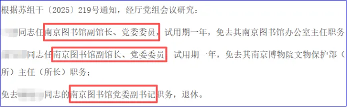 而南京图书馆党委副书记、副馆长等副职领导,则由江苏省文旅厅党组直接负责任免。