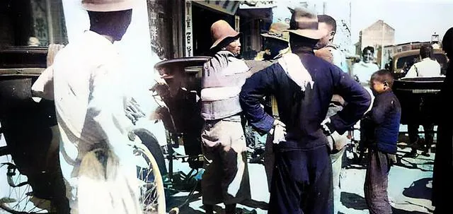 街口有人挑着扁担慢慢晃过去,左边推车的,右边掂篮子的,只看动作,就知道谁是本地的谁是外地的,衣裳上沾着泥巴的多半是赶集回来的,照片偏黄,脚下地板砖还带着泥点,小时候跟着大人走街串巷,看得头晕,最喜欢路口小摊,遇上日军兵巡的时候,大人都低着头,步子迈得又快又轻,妈妈嘴里老嘱咐,“别乱看,别出声”,那种小心翼翼,一直是南京人骨子里的记性。