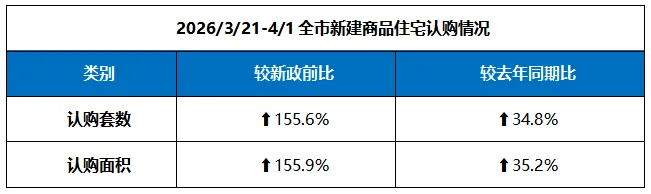 3月21日至4月1日,全市新建商品住宅认购套数和面积较新政前分别增长155.6%和155.9%,较去年同期分别增长34.8%和35.2%。