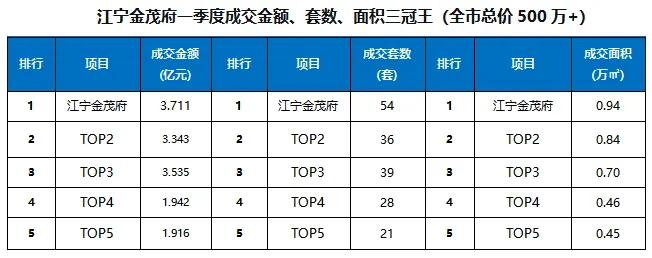 成交表现:南京市一季度总价500万元以上项目中,成交金额、套数、面积均位列第一。