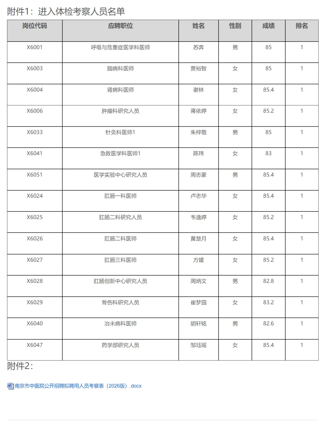 根据《江苏省事业单位公开招聘人员办法》(苏办发〔2020〕9号)和《南京市卫生健康委员会、南京市机关事务管理局部分事业单位2026年公开招聘卫技人员公告》(宁事招公告(R)﹝2025﹞27号)文件精神,现就南京市中医院2026年公开招聘卫技人员(岗位信息表二博士研究生岗位)体检考察工作有关事项通知如下:
