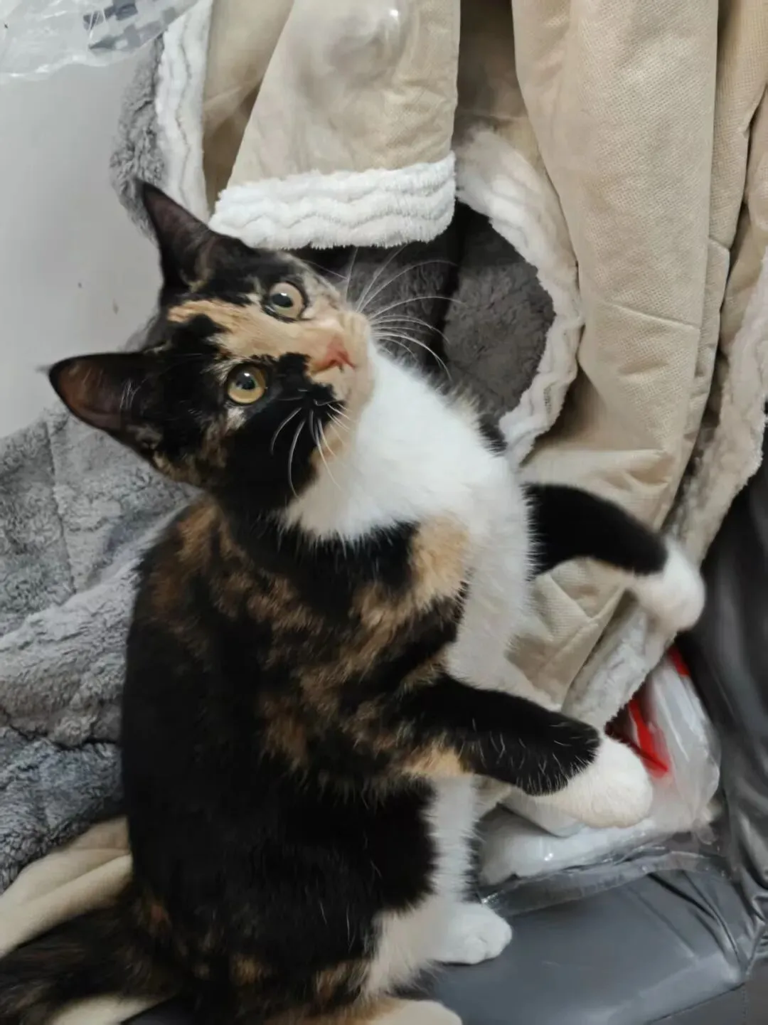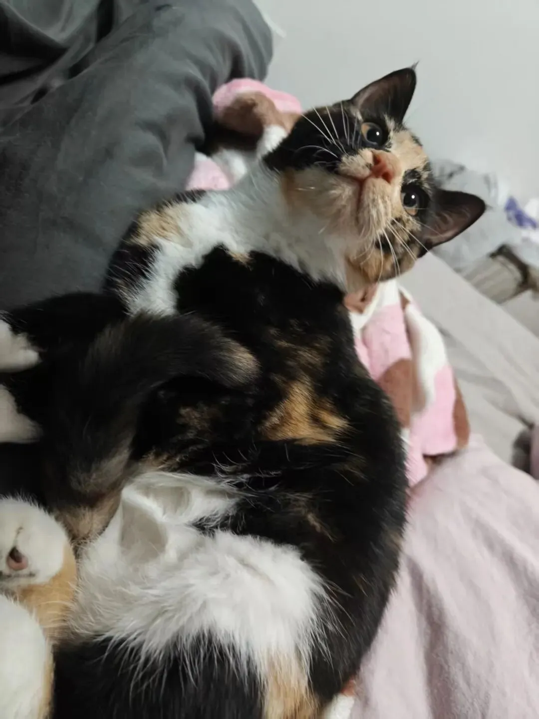 总结来说,就是对陌生人会胆小,但是对熟人就是给撸给抱的小猫了。特别喜欢舔人,摸摸她就会开始舔你的手了。逗猫棒十级爱好小猫。是个贪吃的小家伙 ,很容易被猫条收买的小猫咪。和其他小猫也相处的非常融洽