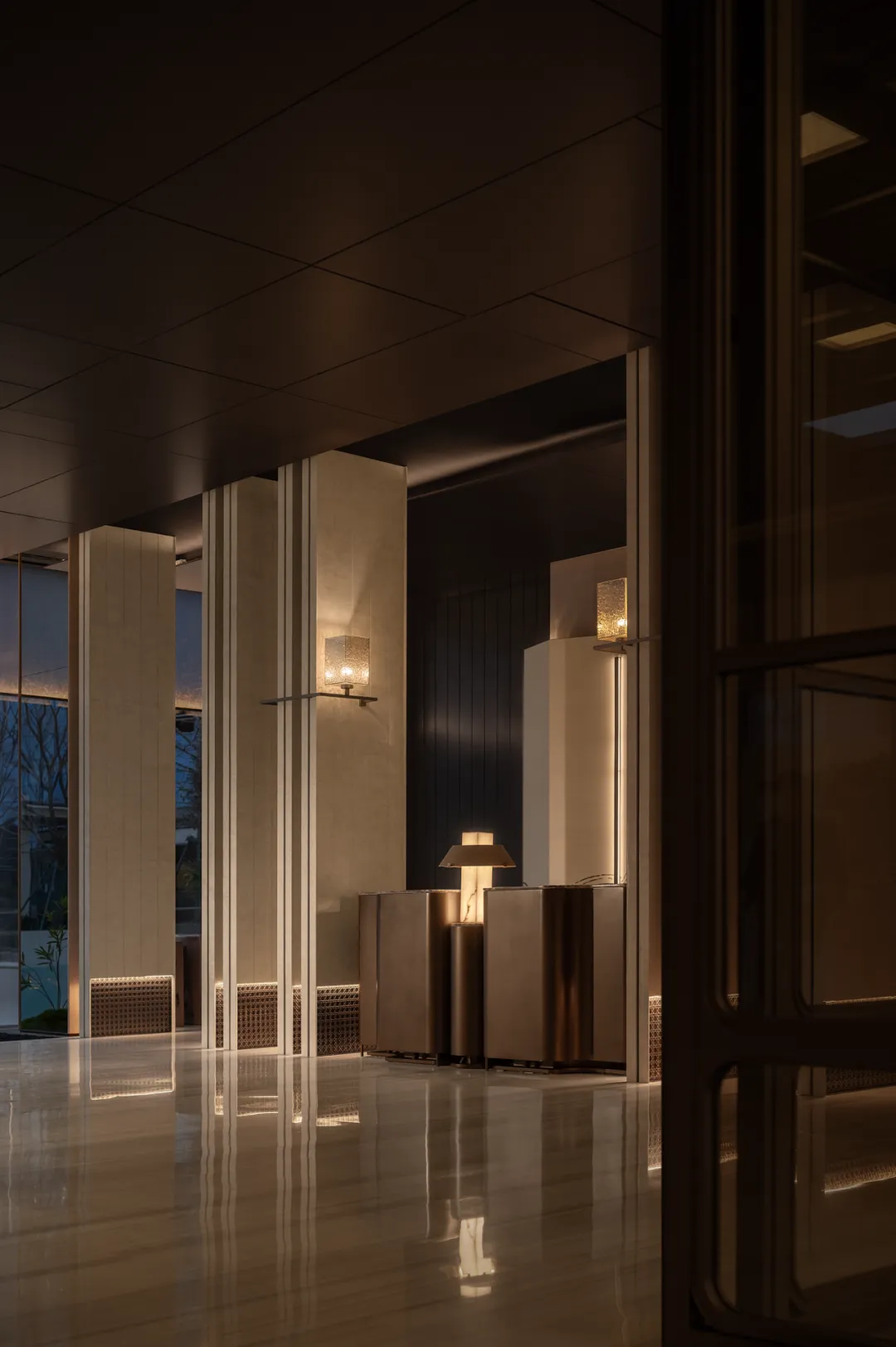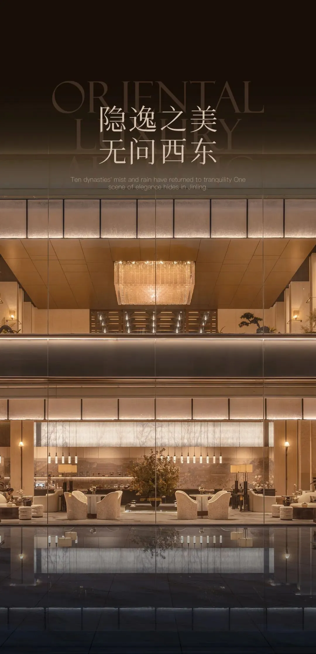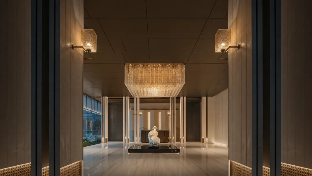 推门见境,光影与材质共生。木色门扉缓缓展开静谧天地,现代金属流苏包裹南京宫灯,让历史文脉与当代美学在此交融。