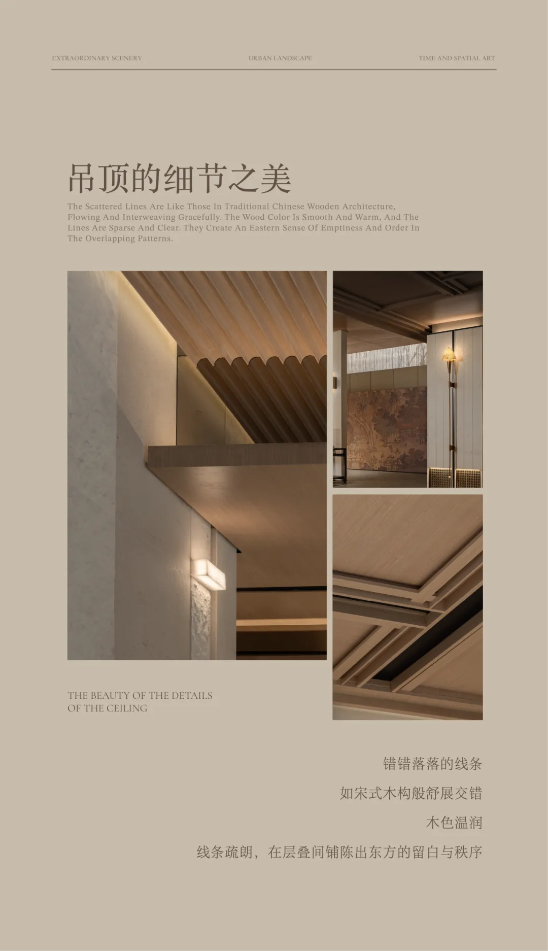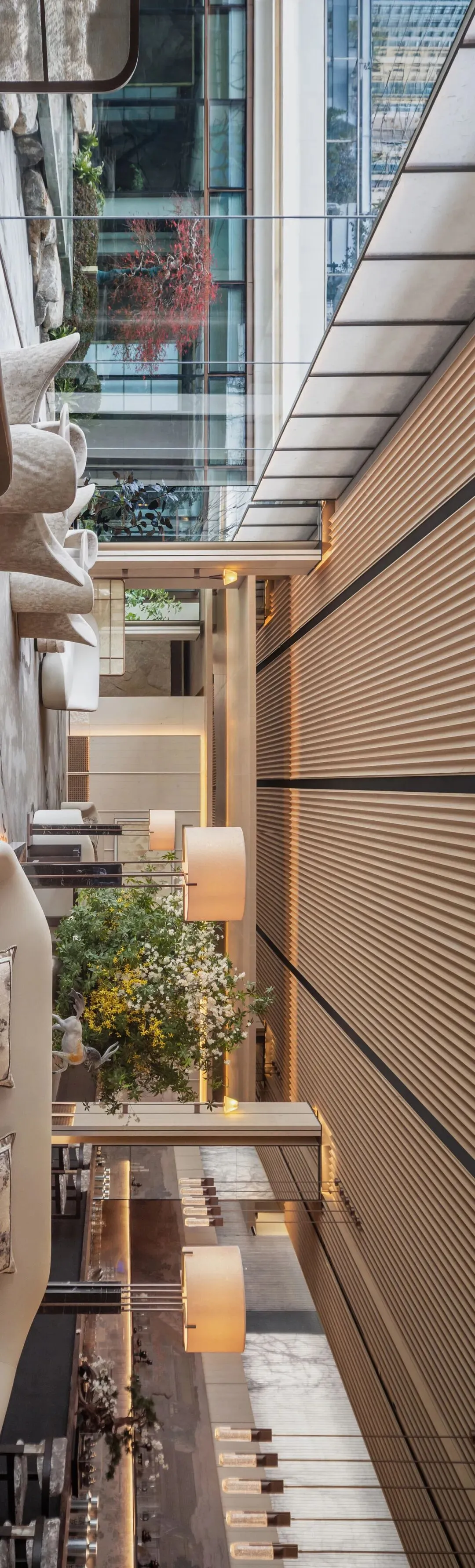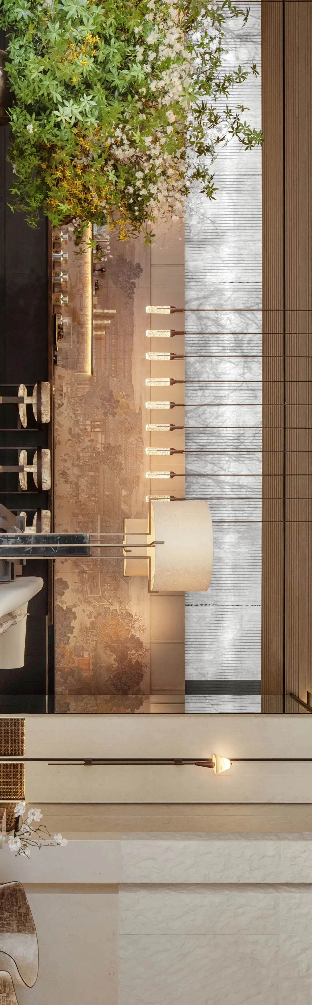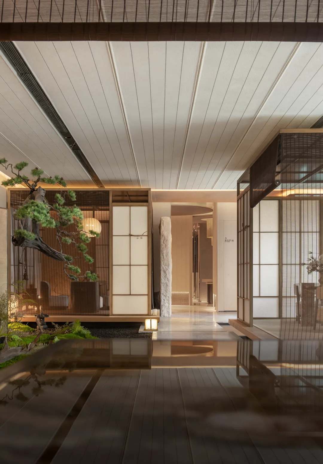 对称的秩序里,体现出仪式感。自然光与暖光相拥,木的温润、石的清冽、光的流动,织就本真诗卷。没有冗余的装饰,每一处转角都藏着东方美学的留白,每一缕光都在诉说着 “少即是多” 设计笔触。