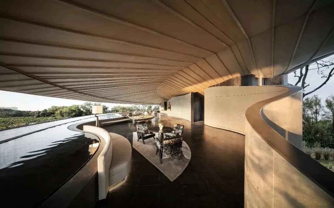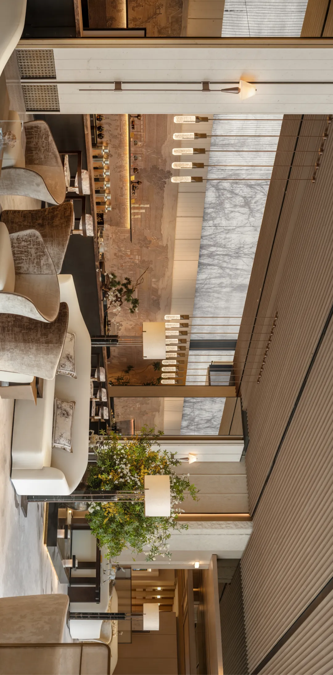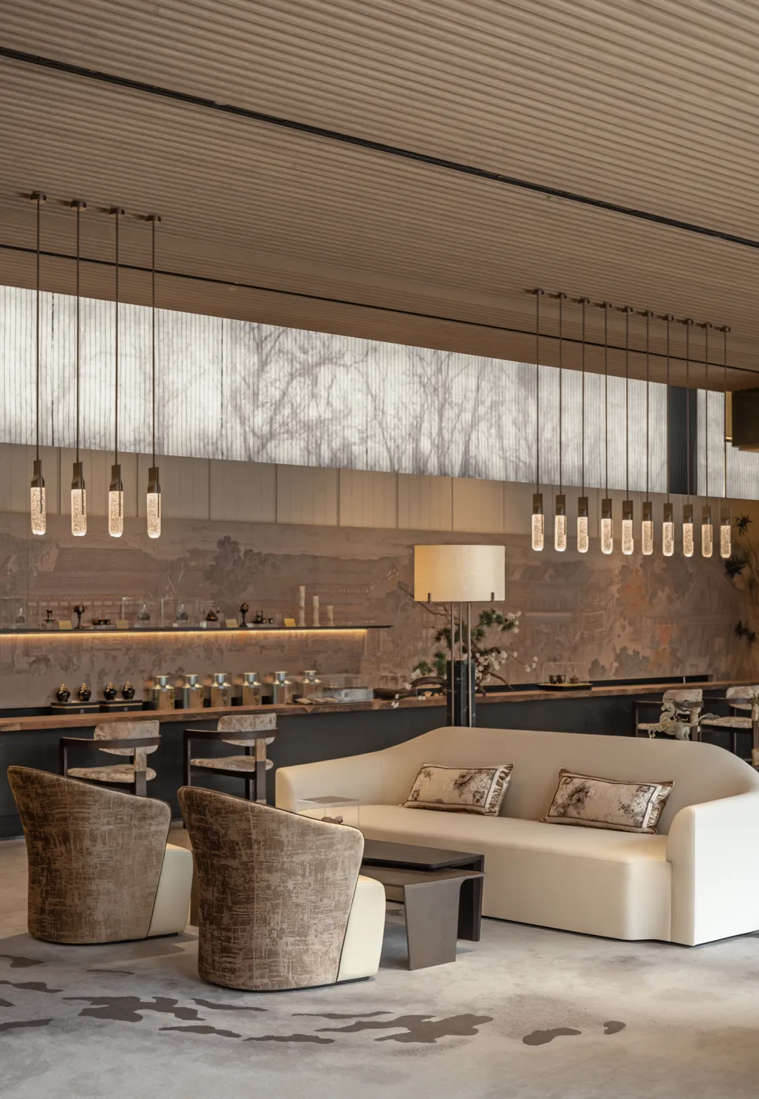 吊顶的波浪肌理与地毯的水墨晕纹形成呼应,材质与光影是绝对主角,交织成沉静松弛的氛围,既保留了东方禅意的安宁,又适配当代社交的从容感,步入其间便觉尘嚣渐远。