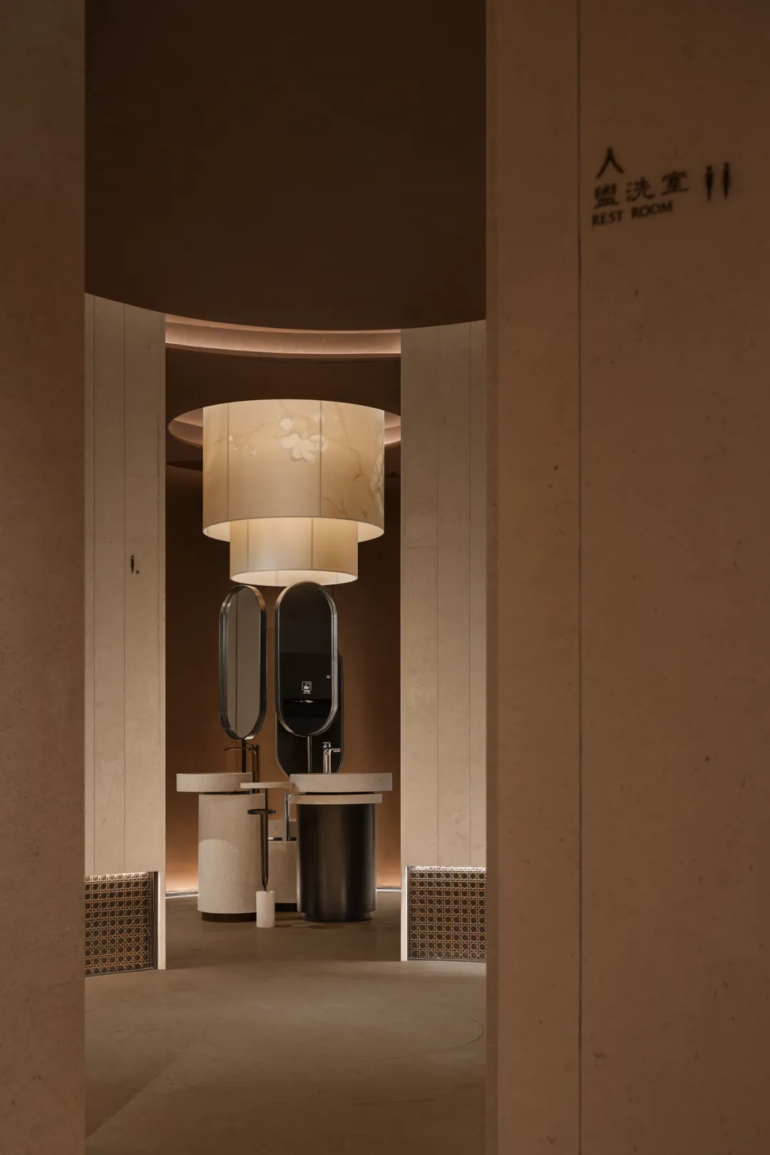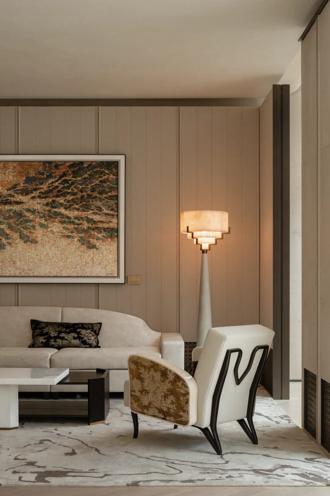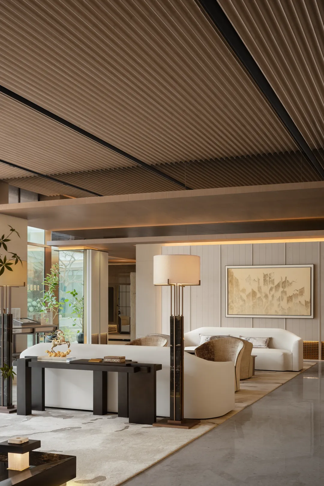 吊顶的波浪肌理与地毯的水墨晕纹形成呼应,材质与光影是绝对主角,交织成沉静松弛的氛围,既保留了东方禅意的安宁,又适配当代社交的从容感,步入其间便觉尘嚣渐远。