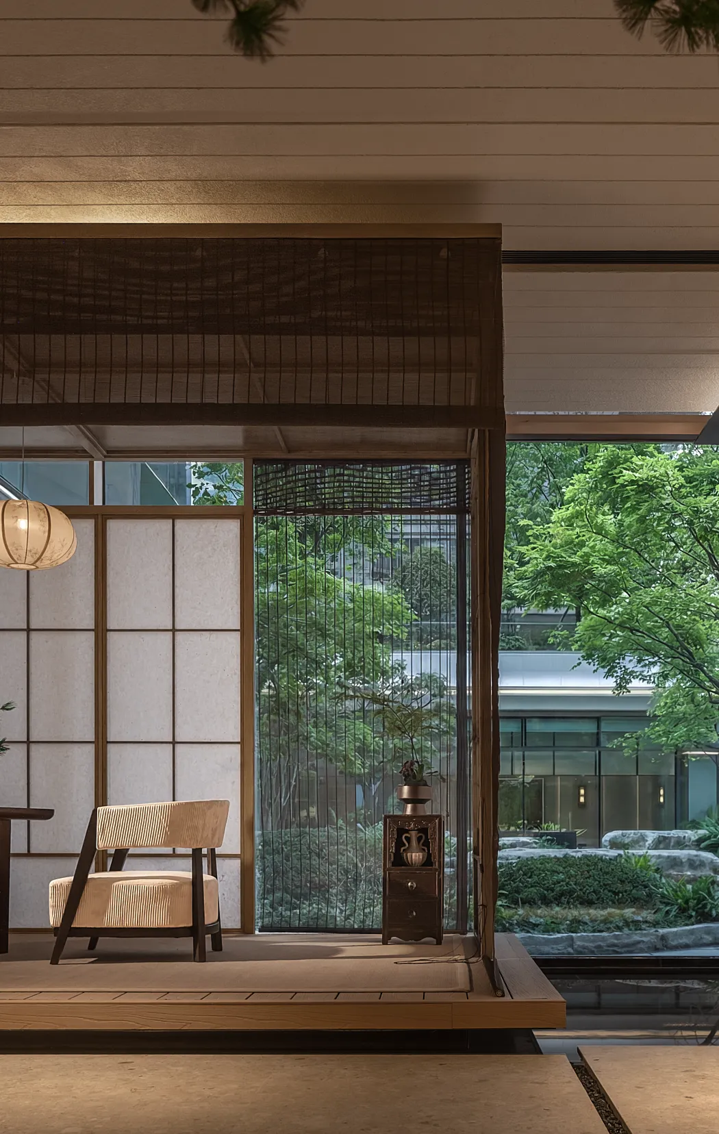 信步闲庭,茶香先于脚步抵达。一整面落地长窗,将庭院的山水引至案前——窗外树影婆娑,自然便在此处落了脚。光从格栅间滤过,柔软地洒在席面上,每一道都是时间的低语。