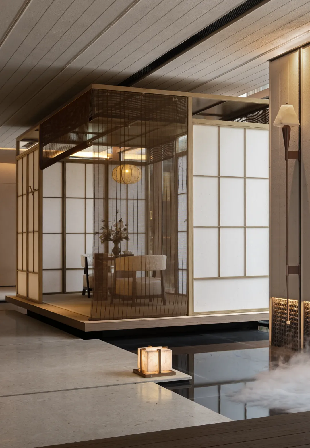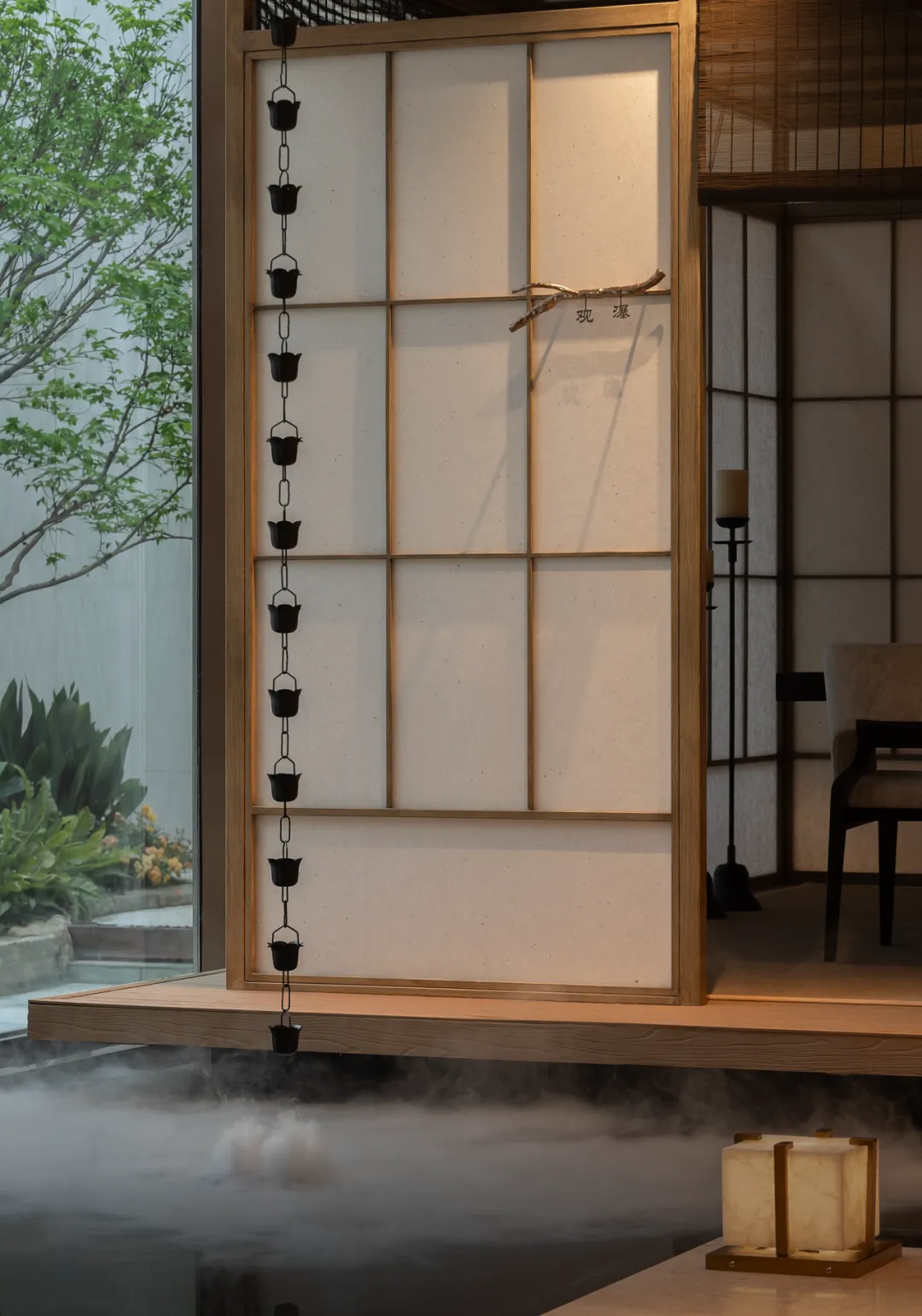 墙角一隅,有水景/青苔和碎石,水雾弥漫间,室内外之景在此交融,分不清是庭院入了室,还是室成了庭院。