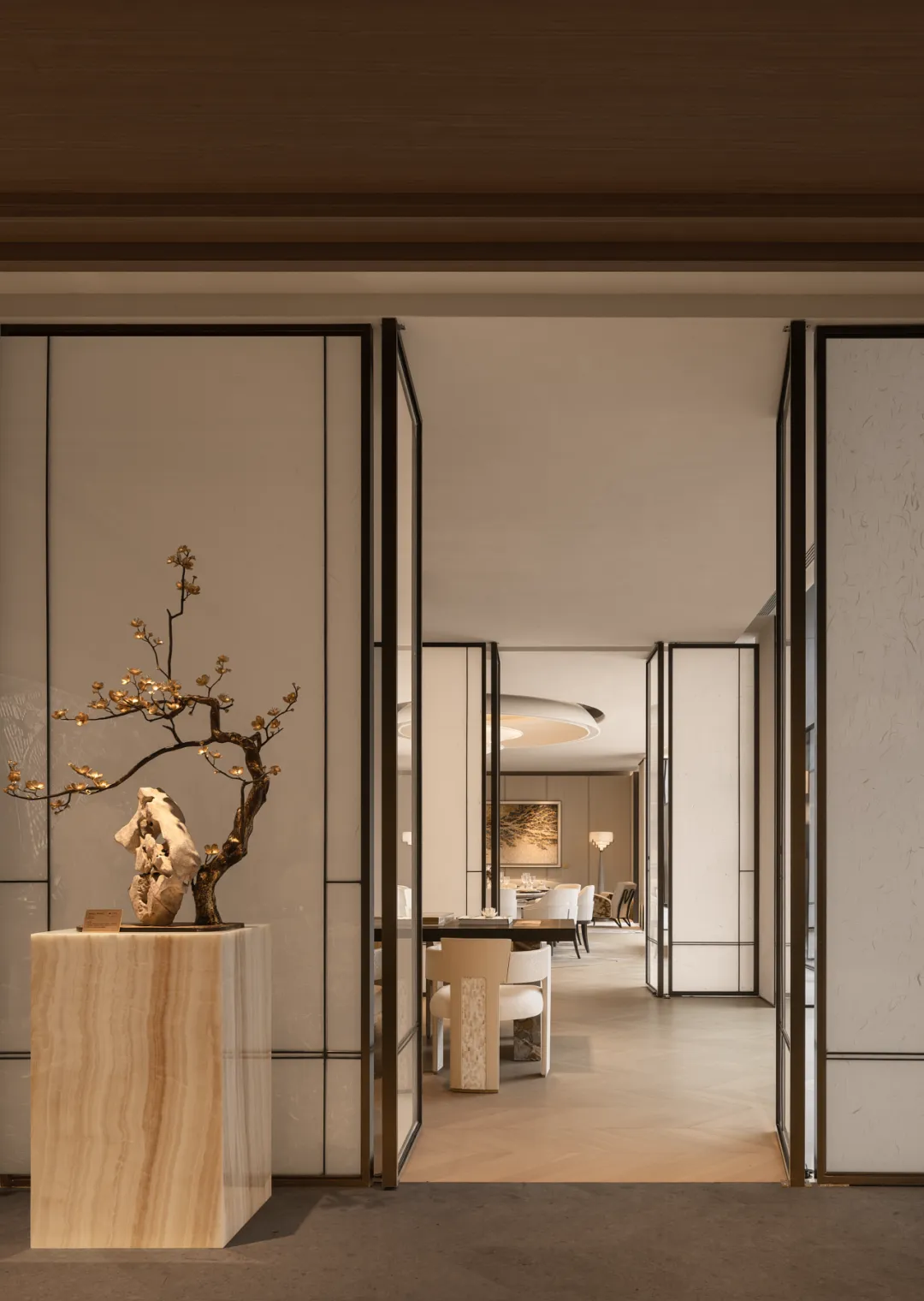 框景造境,于方寸间藏尽东方意趣。黑框半透屏风如同画框,将廊道与内室层层框入视线,既划分了功能边界,又保留了视线通透感,把东方园林的留白意趣,搬进当代空间。