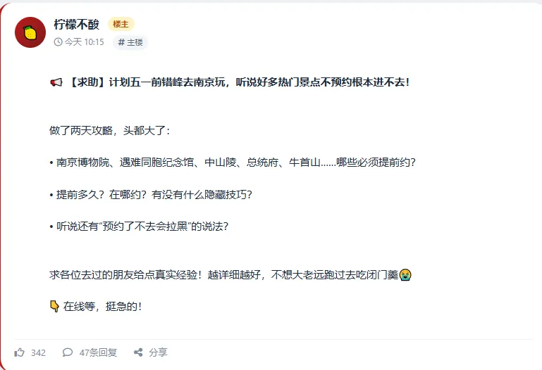 这是一位计划五一来南京旅游的楼主,他的帖子刚发出来,就有一大群人的回复。