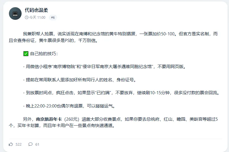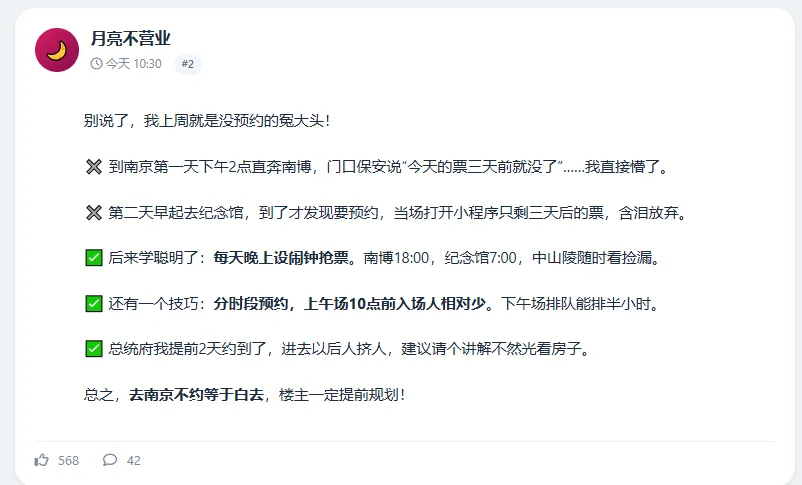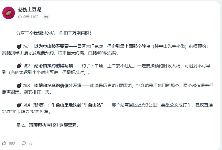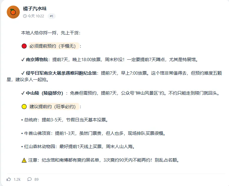 如果是第一次来南京旅游的小伙伴肯定会逛各种攻略,以一个南京生活多年的中年大叔,我截取一些攻略帖子整理出来,有各种靠谱的攻略,防坑指南,在最后还有一份超强预约指南。