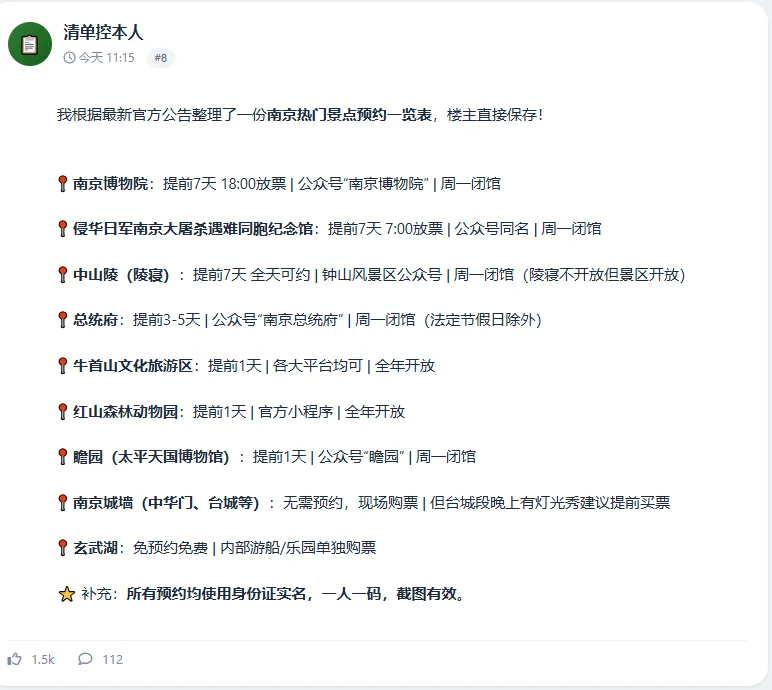 这位号称本地人的热心人,将一些景点的预约全部都贴上去了,看样子是没少帮忙做攻略。