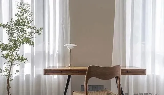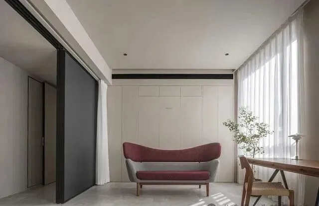这块叫多功能房,没放大床,进门就是一张沙发,有客来的时候其实这沙发后面还藏着一张墨菲床,平时没动静就是看书喝茶地儿,等父母来了,这一拉一放,卧室就现出来了,玻璃推拉门一拉上,跟外头断了联系,在家办公甚至午休都稳妥,前面有张原木书桌,桌角下一盏台灯,晴天的时候阳光全落在书本上,谁说小房就得挤着窝着,咱这叫空间三吃。